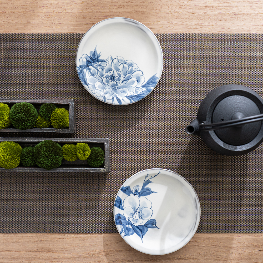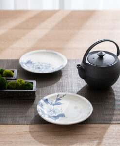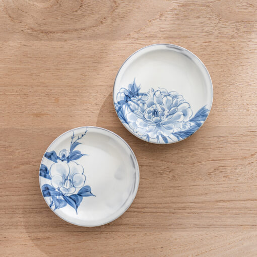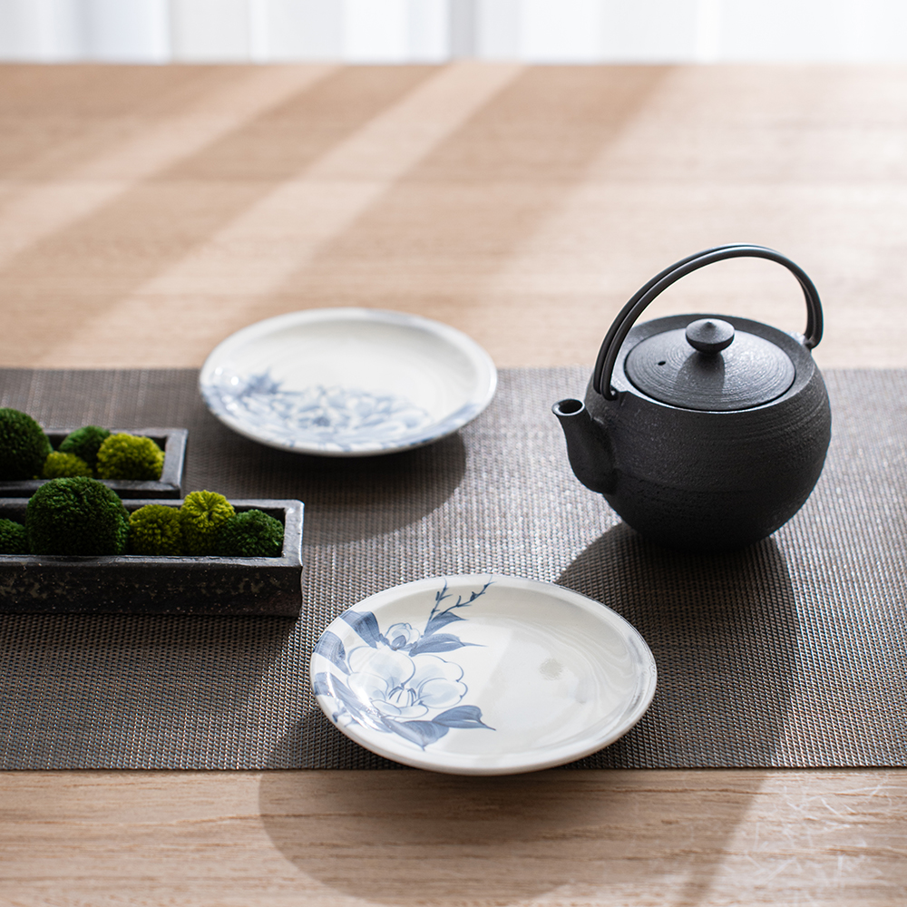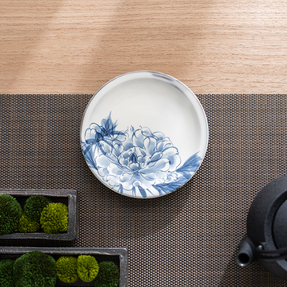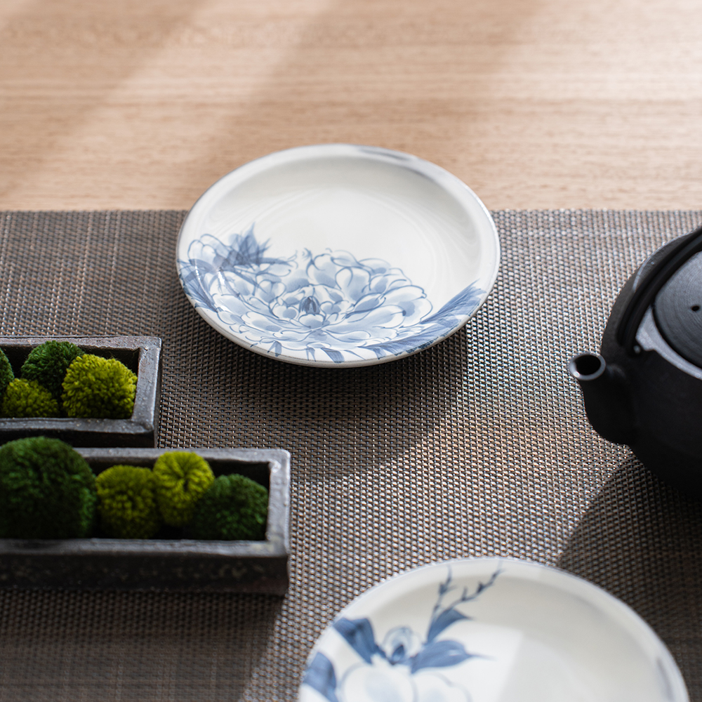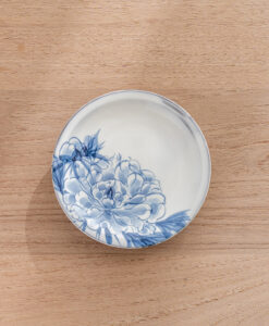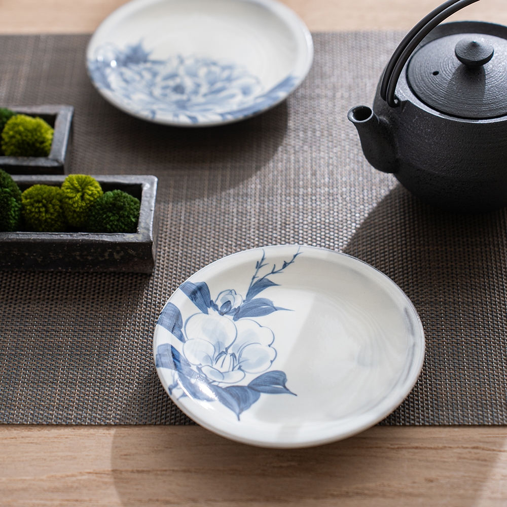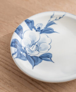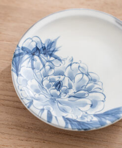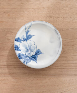 清水燒出品,以典雅的藍色染付呈現日本四季的花卉之美。在粉引的素白胚土上,以細膩筆觸描繪出牡丹、椿等花草的姿態,藍色濃淡交織出清新柔和的韻致,展現出清水燒特有的高雅氣質。