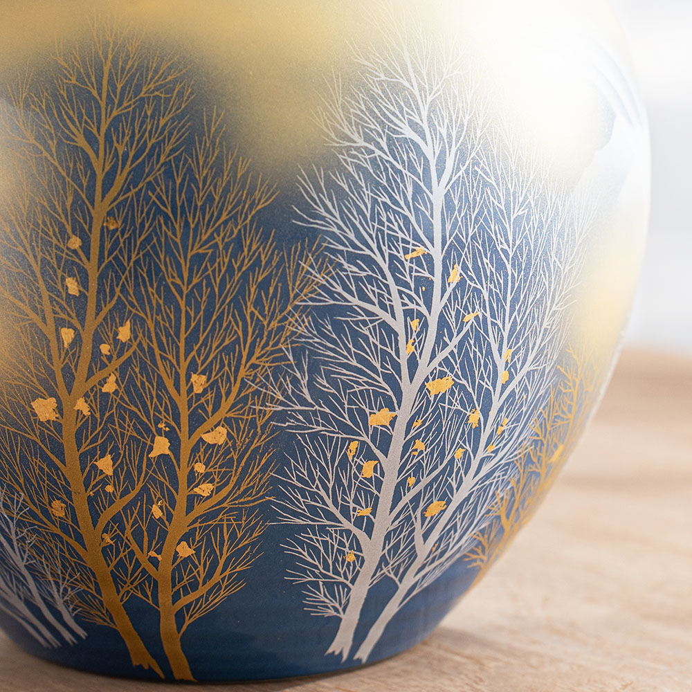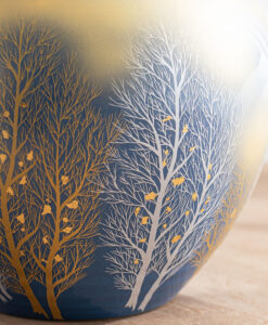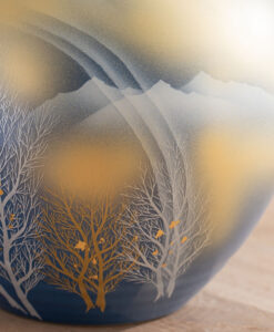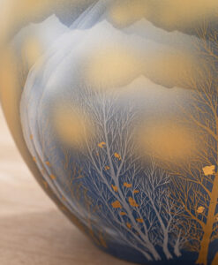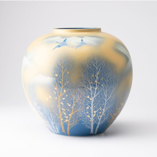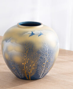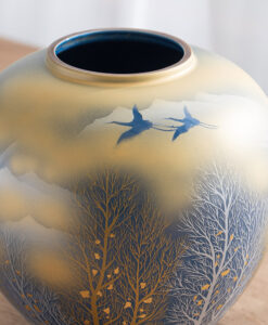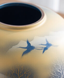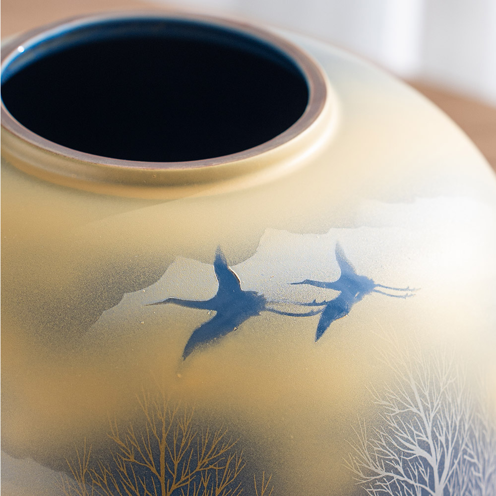 畫面中,遠處的群山以柔和的筆觸描摹,營造出縹緲朦朧的意境;天際間有兩隻仙鶴優雅地振翅飛翔。前景則以精準的筆法描繪出一片樹林,並以金箔點綴樹葉,宛如在光影中微微閃耀。靜與動、光與影等多重元素交織,形成和諧而細膩的視覺表現,整體氛圍寧靜雅致,使這只花瓶堪稱雋永之作。