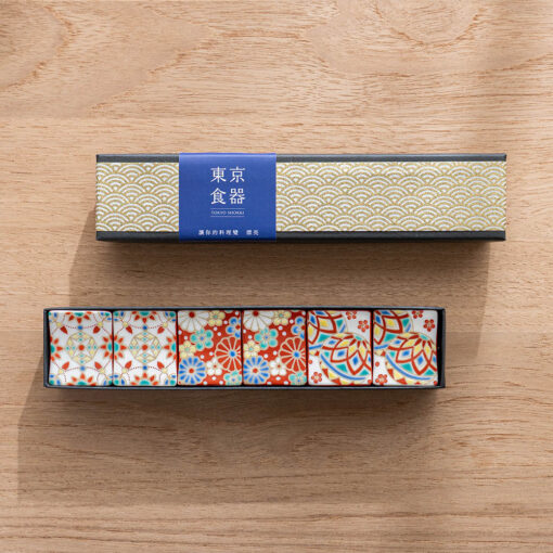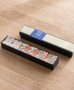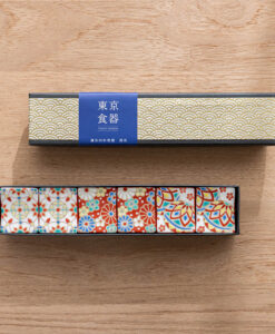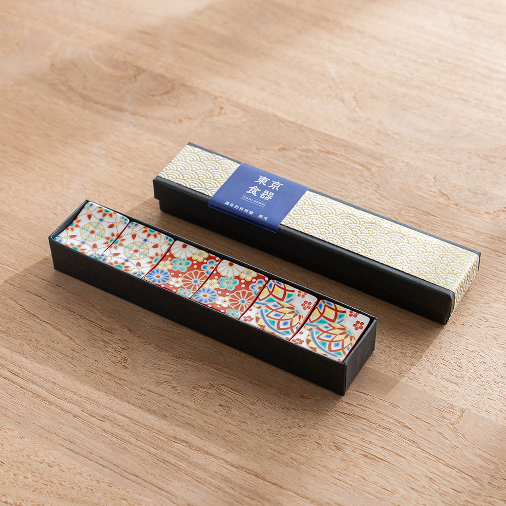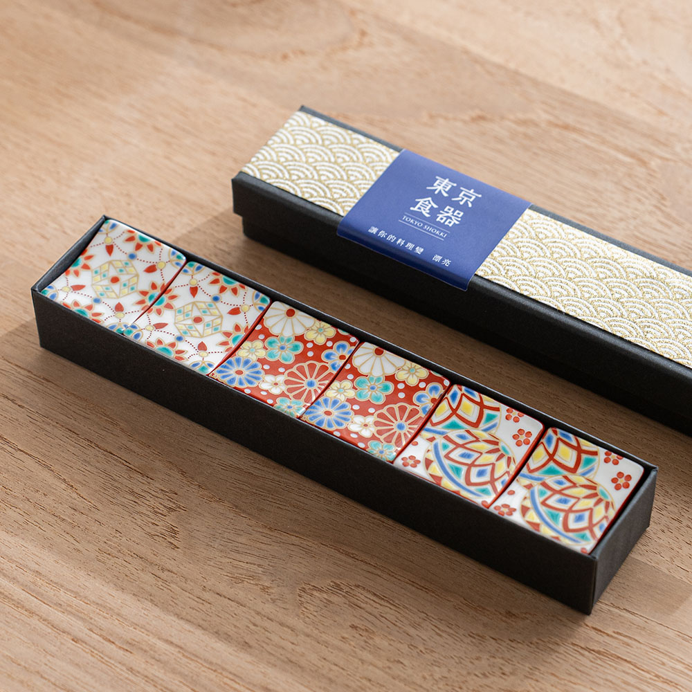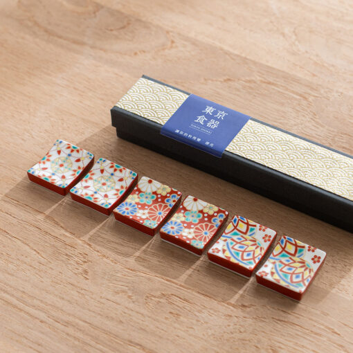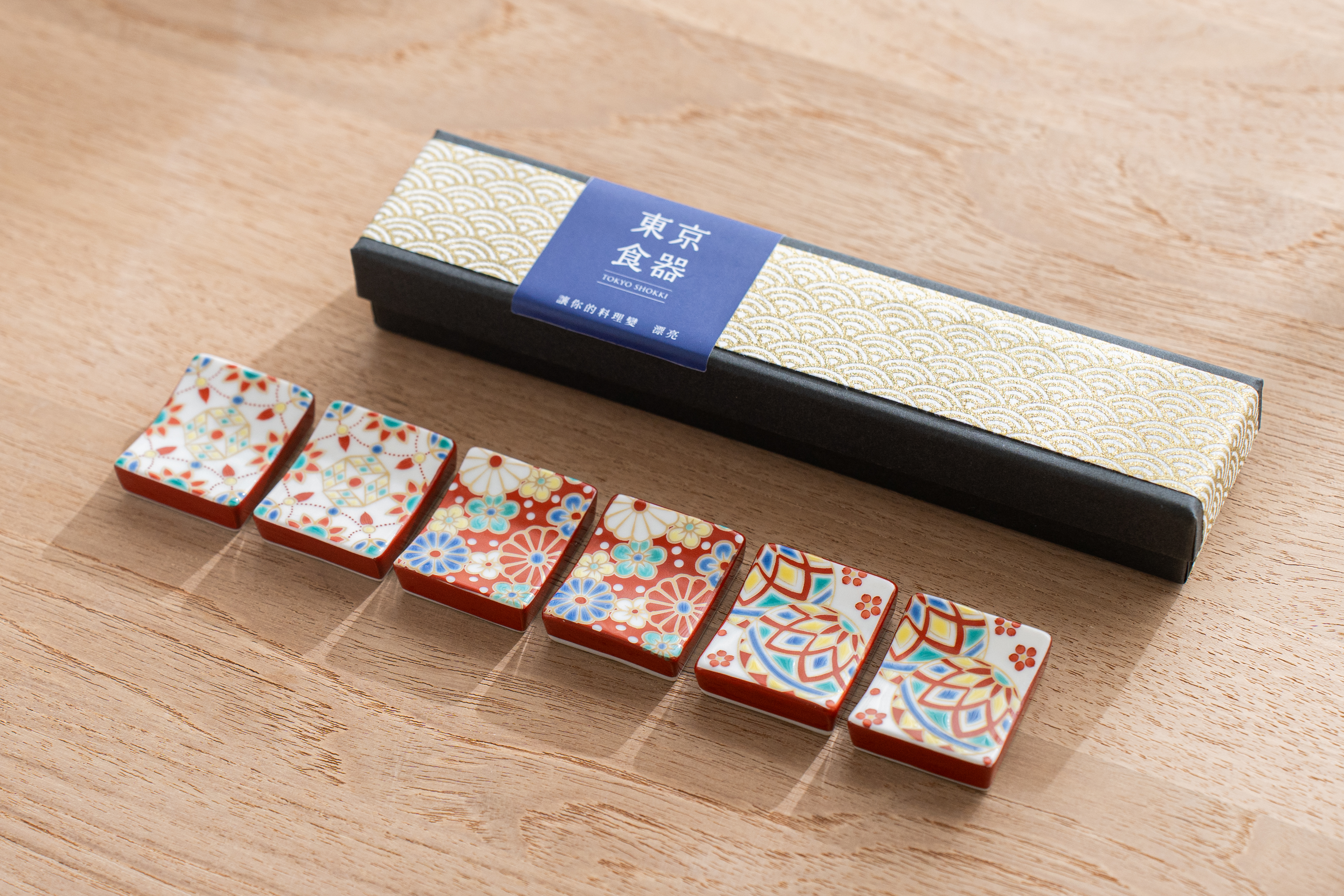 小巧的筷架,配上艷麗的九谷五彩圖紋,成為餐桌上顯眼的小配件。收集紅色系的三種紋樣:瓔珞紋、手鞠、梅菊紋的筷架禮盒組,做為喬遷贈禮,十分體面又極具巧思。