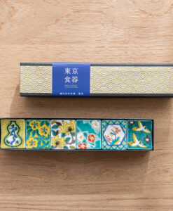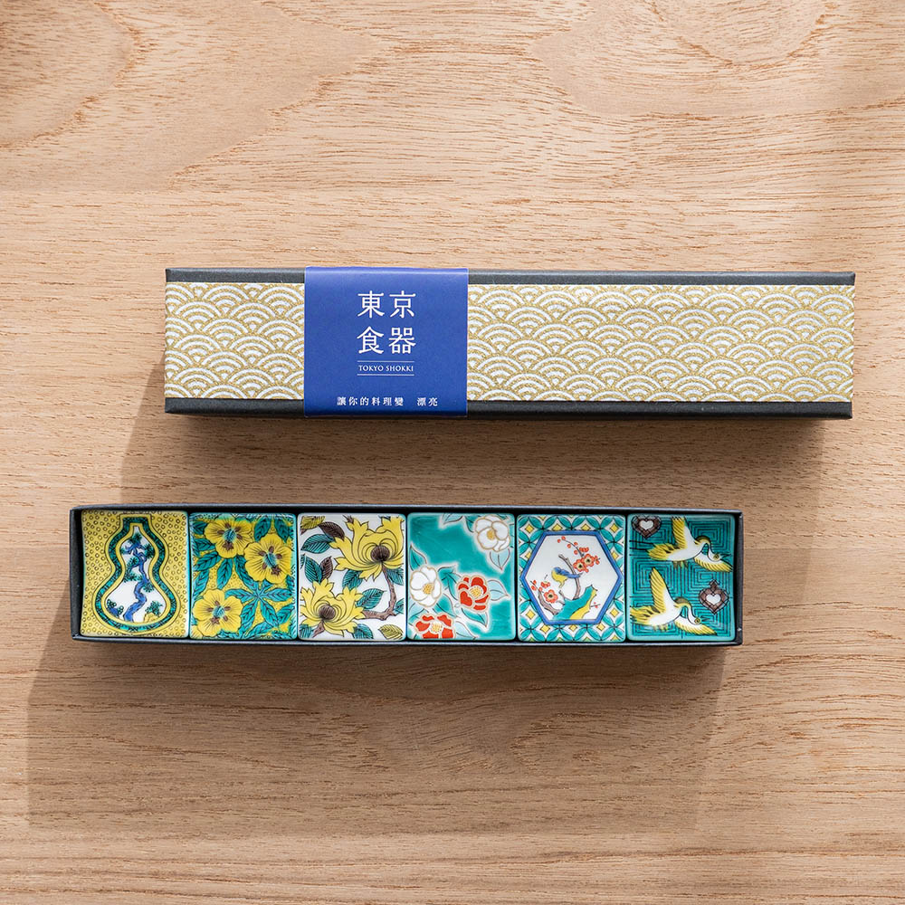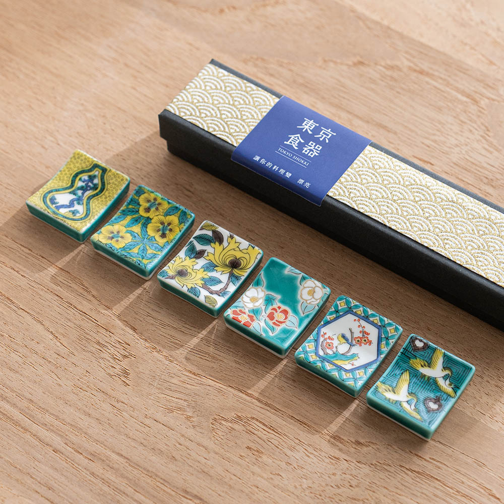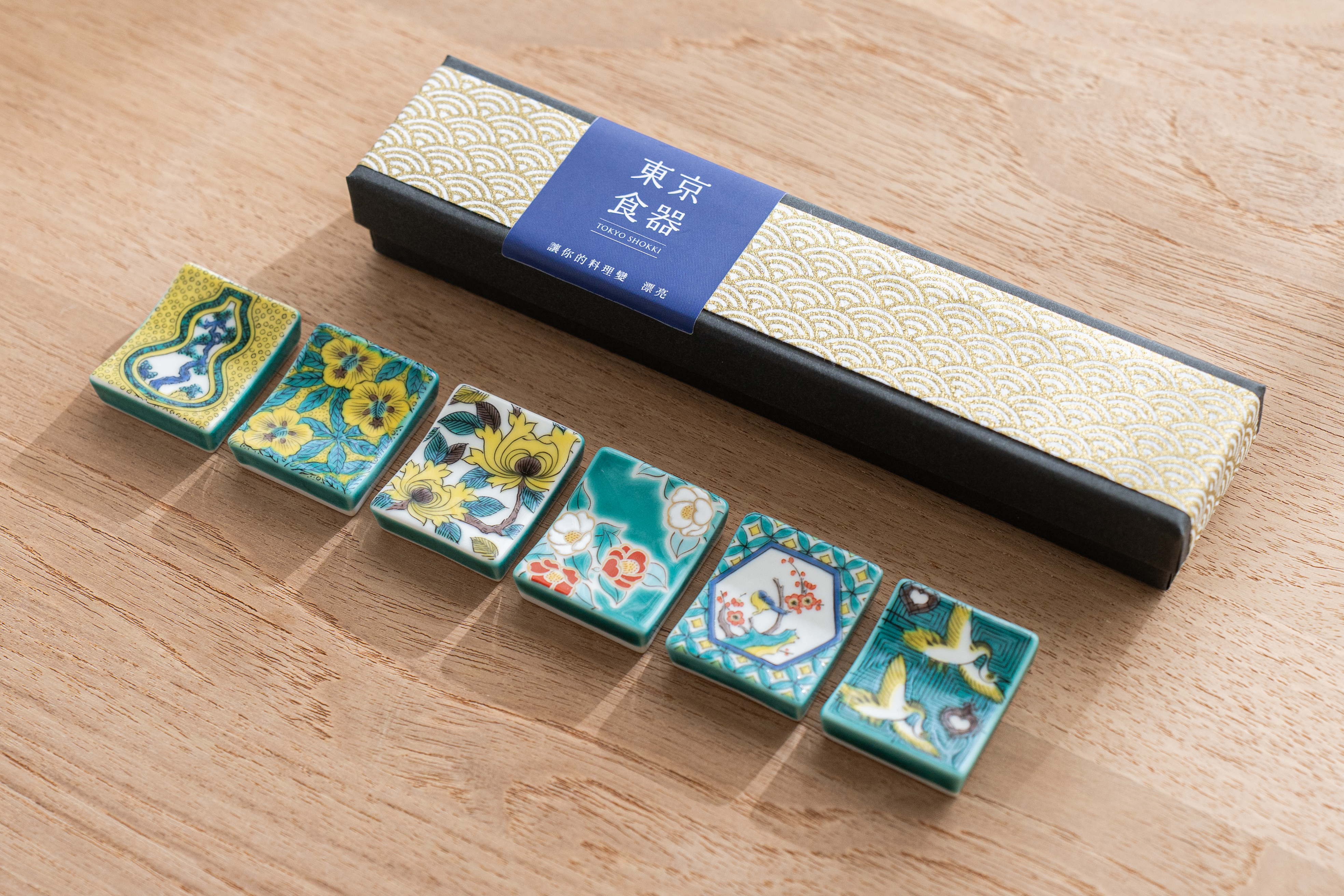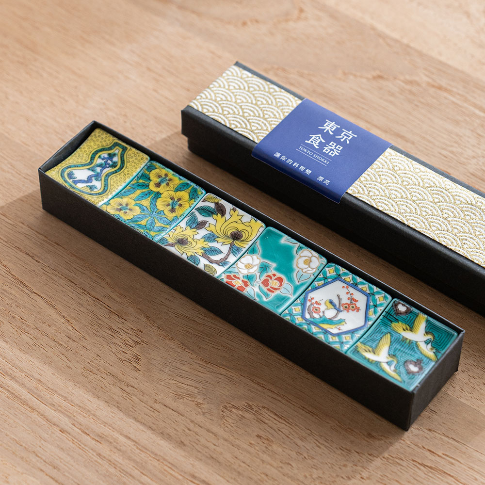 小巧的筷架,配上艷麗的九谷五彩圖紋,成為餐桌上顯眼的小配件。收集緣起系的六種紋樣:青手鶴、彩繪牡丹、青手葫蘆、吉田屋風葵、山茶花、花鳥的筷架禮盒組,做為喬遷贈禮,十分體面又極具巧思。