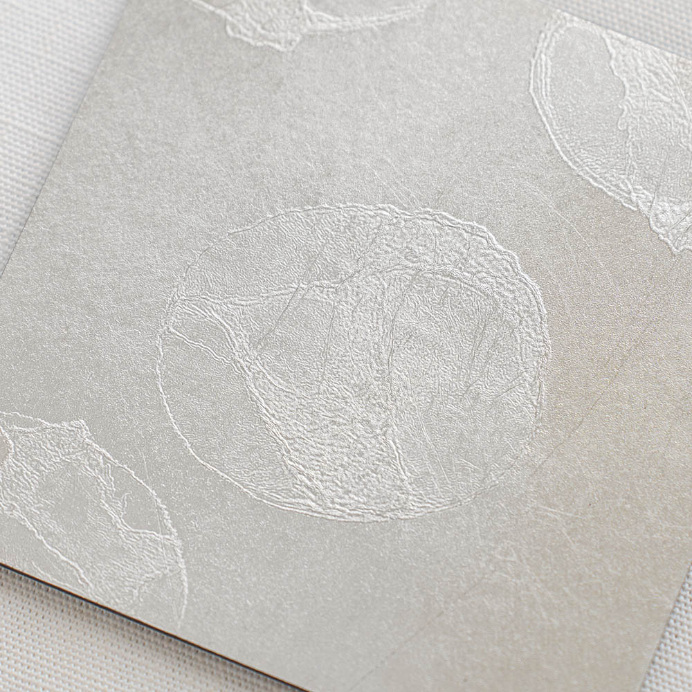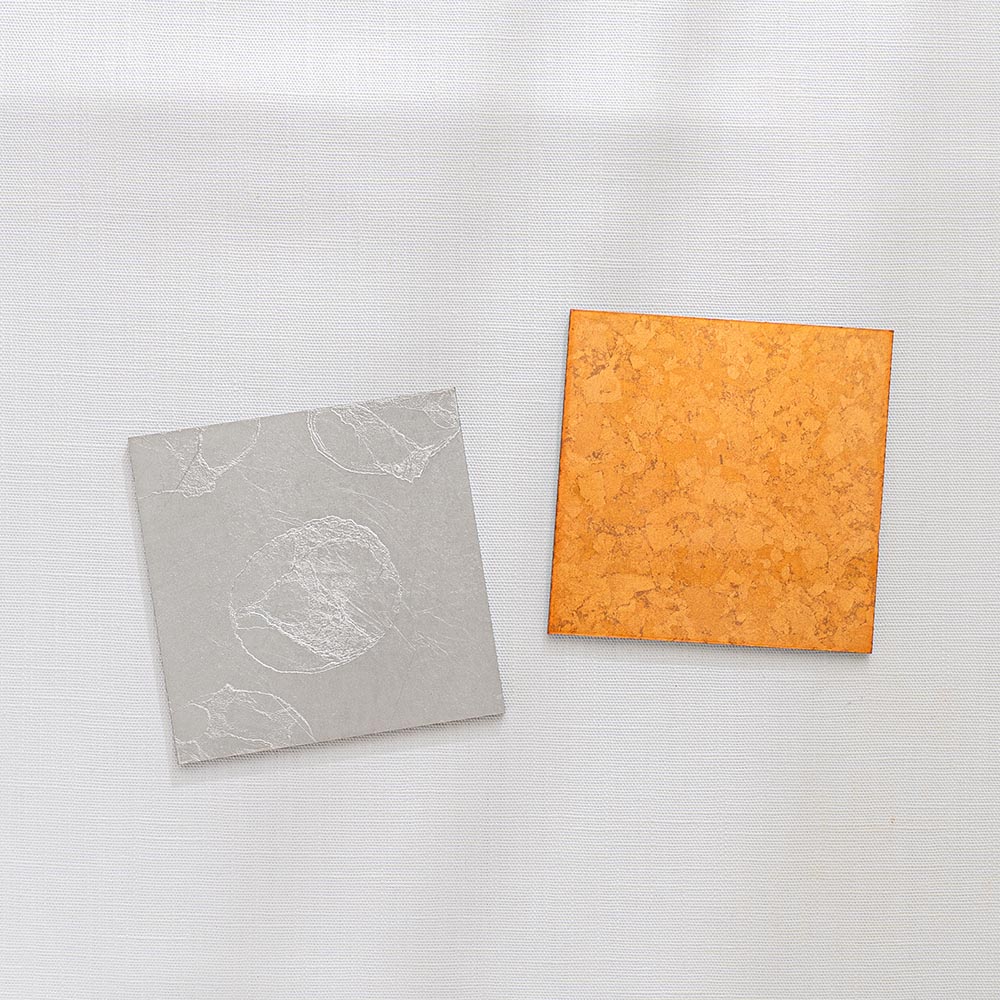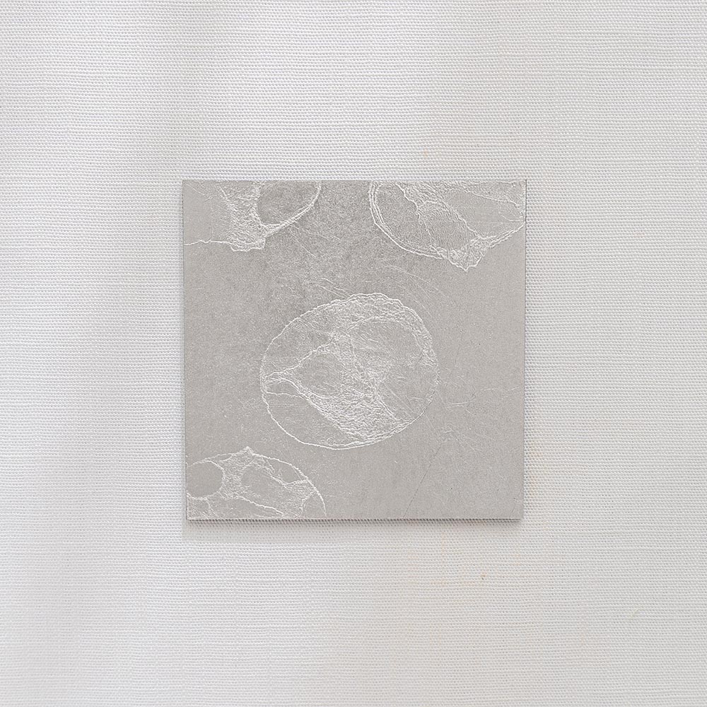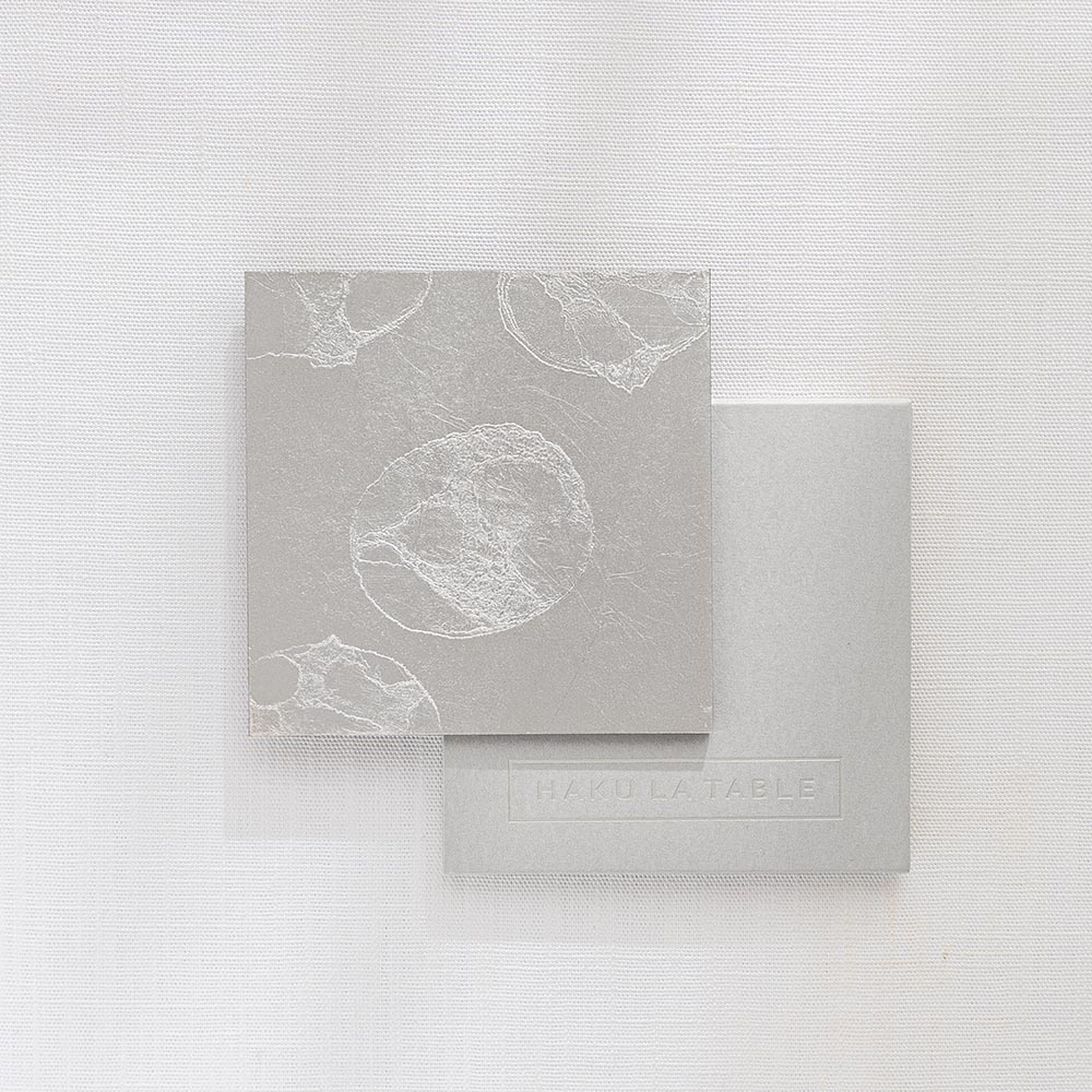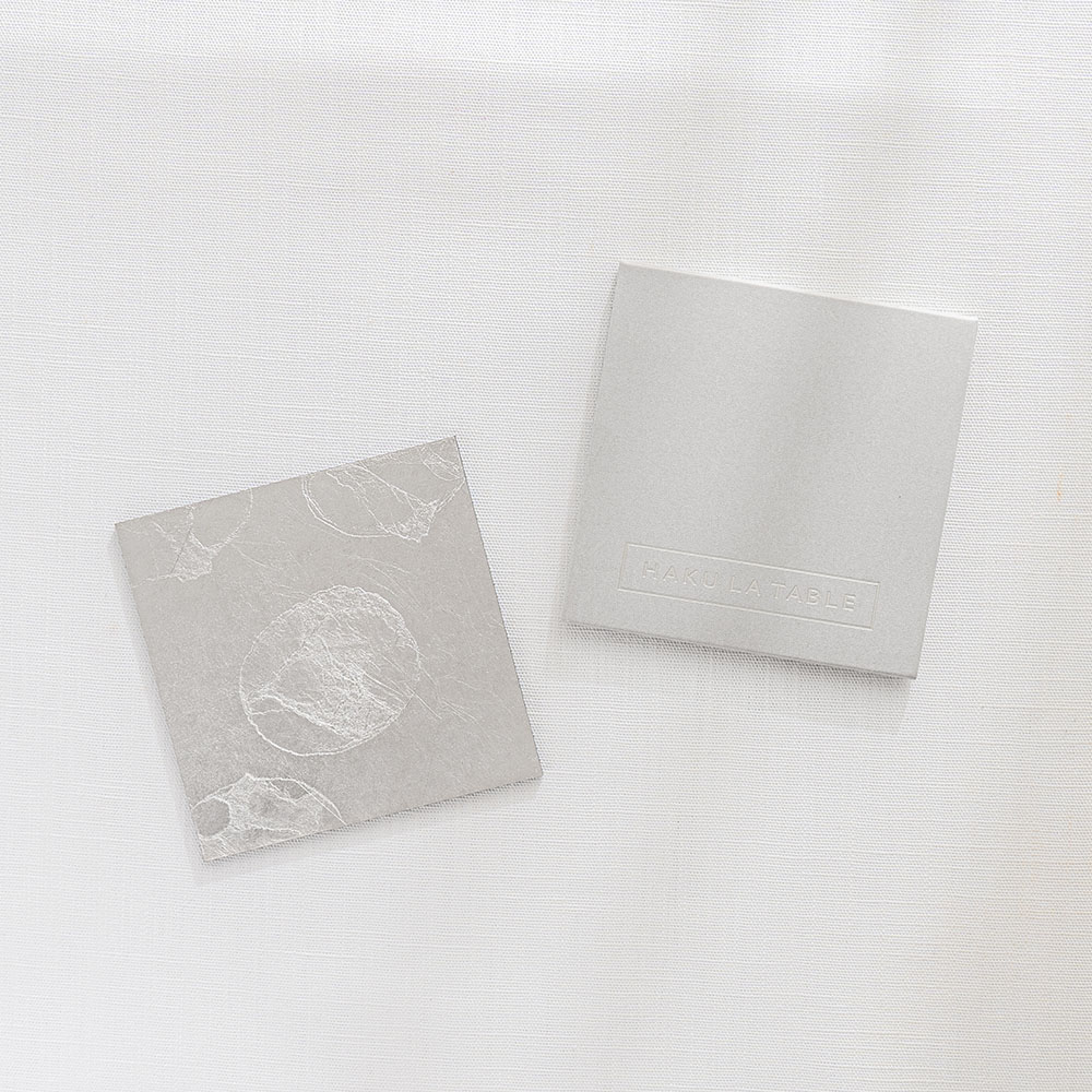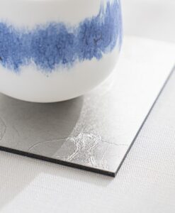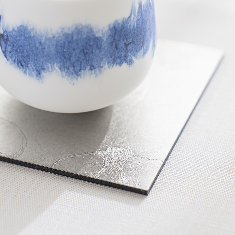 不同於金箔的燦爛奪目,銀箔以其特有的冷冽與內斂,為現代餐桌帶來一種「靜謐感」。每一片杯墊上的銀箔紋理,皆是工匠手工貼製時自然形成的細裂與摺痕,如同冰裂、如同雲影,具有不可複製的藝術價值。置於透明玻璃杯下,能完美襯托出液體的透度,營造出一種空靈且具層次感的飲用體驗。