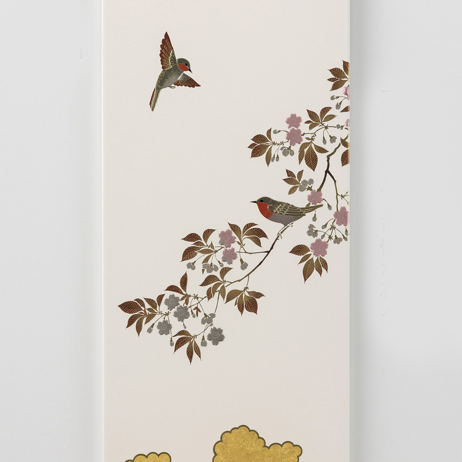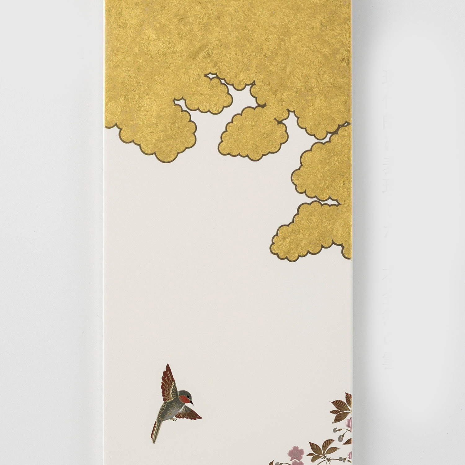 這款藝術裝飾板描繪了充滿生命溫度的兩隻靈動小鳥與嬌俏花卉,搭配閃耀的金色雲朵,令人觀之心情恬靜祥和。背景點綴著波光粼粼的純金箔金雲,以現代手法重新詮釋日本傳統美學。在寧靜的氛圍中增添了一抹華麗感,為空間帶來深度與格調。