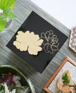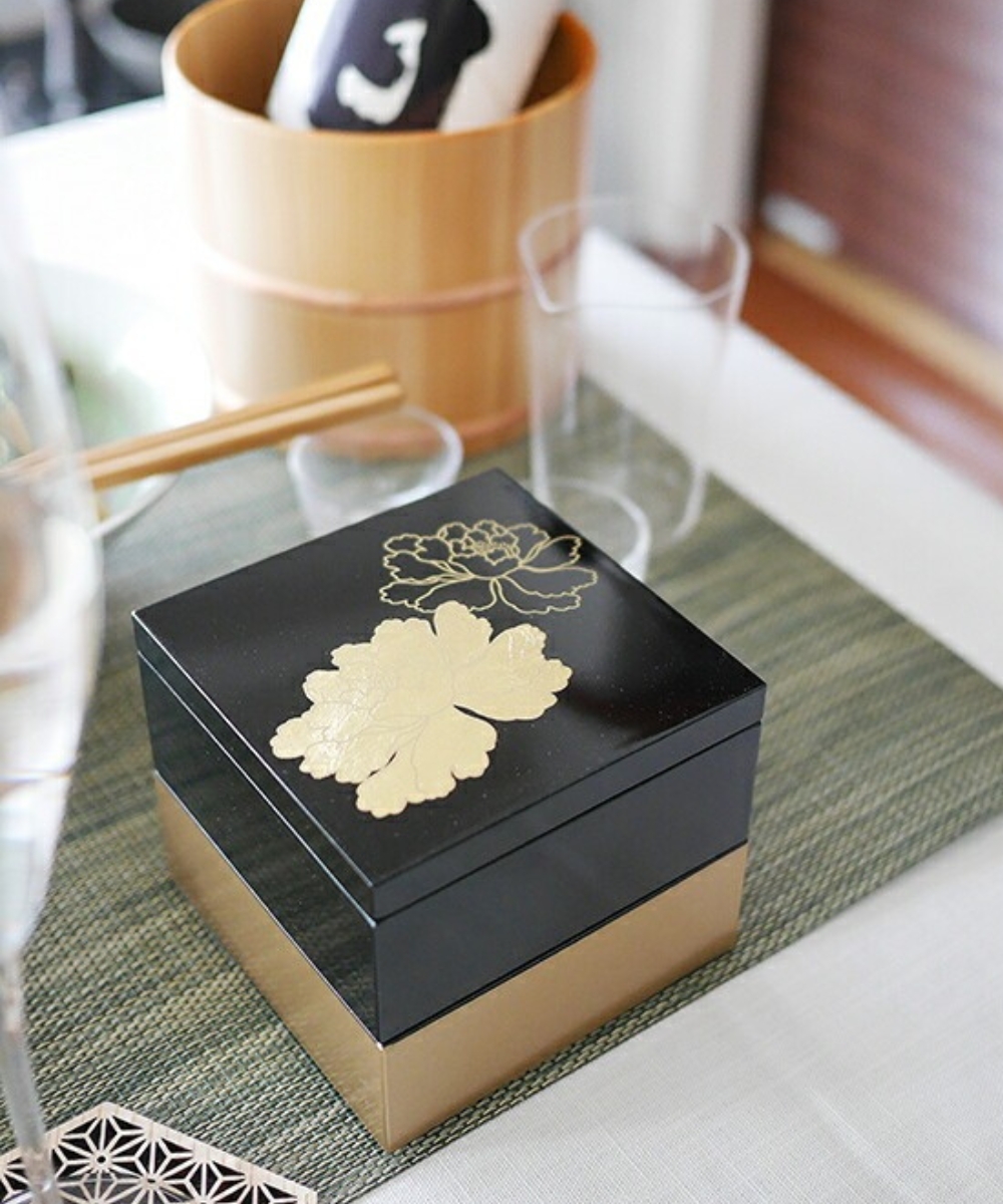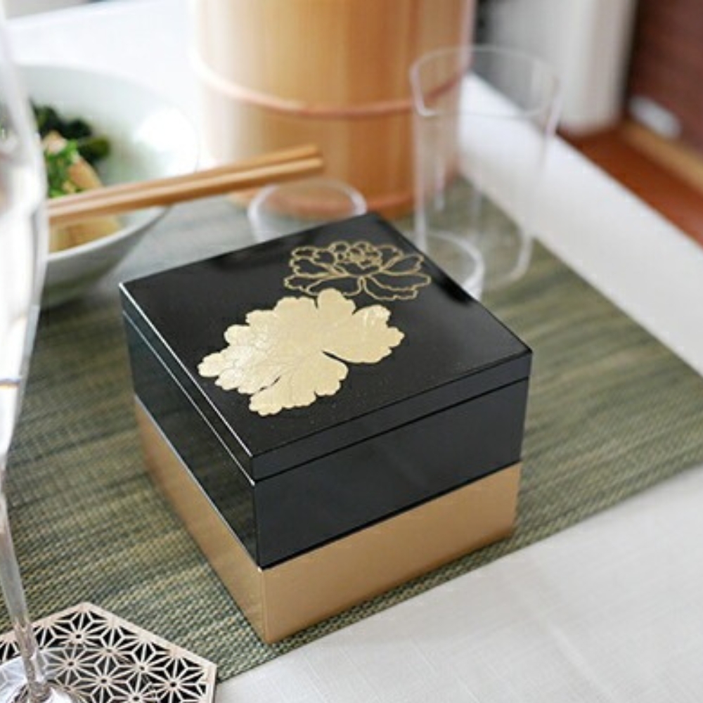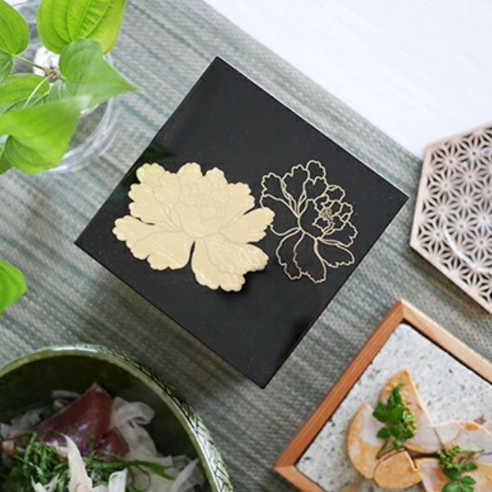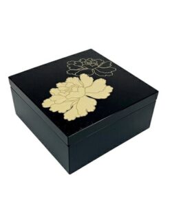 3.5寸方形漆器盒 金箔牡丹 黑 /越前漆器