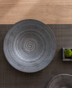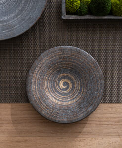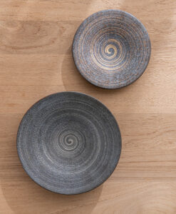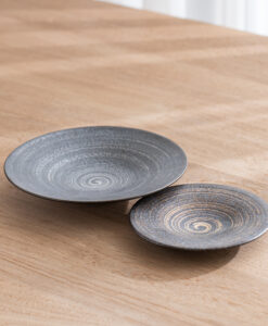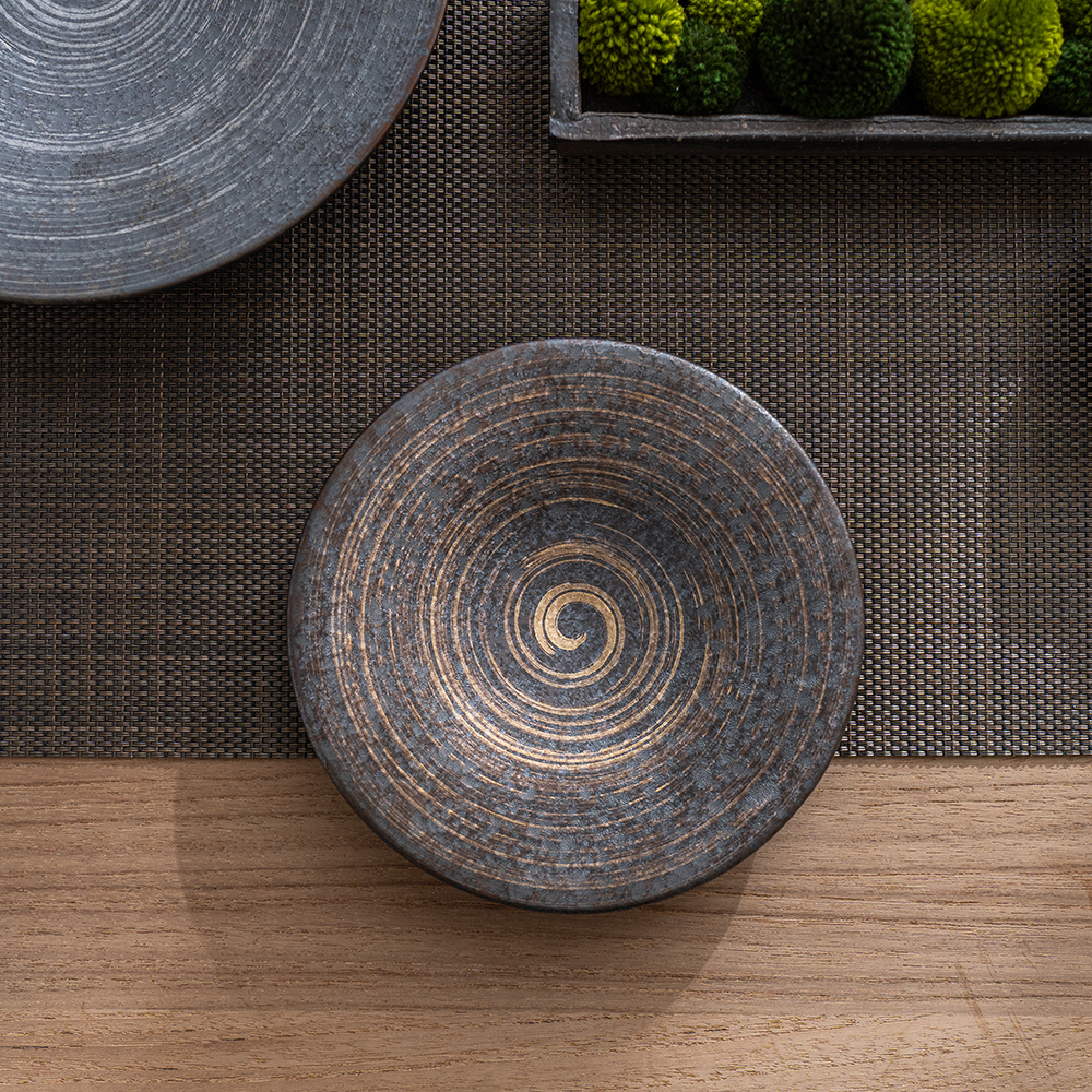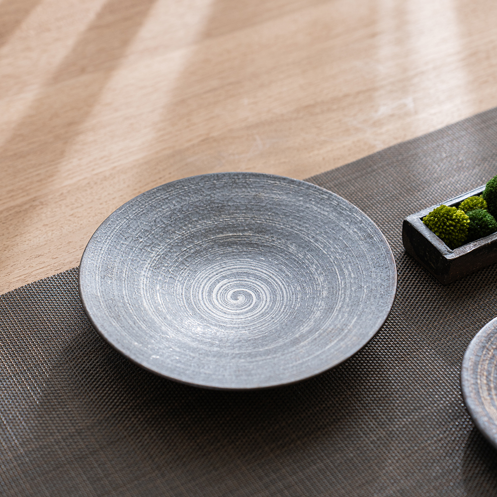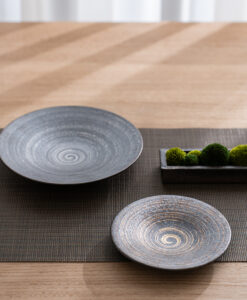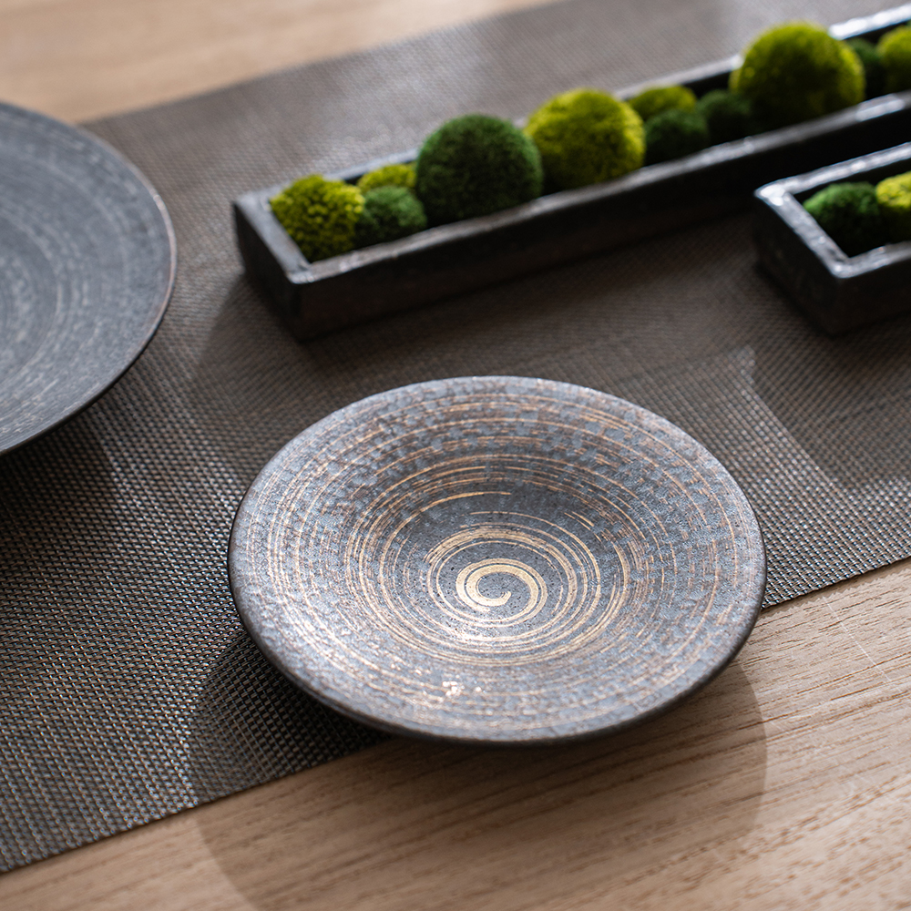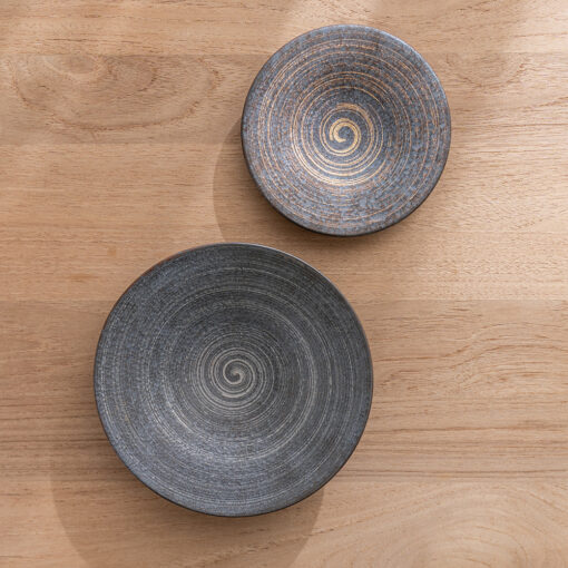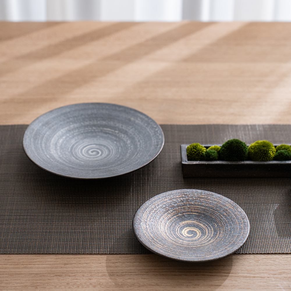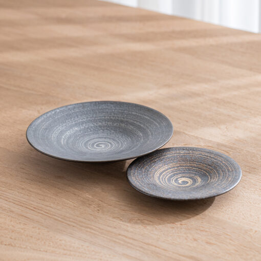 此款圓盤以典雅而低調的金箔/銀箔融入黑色陶土中,展現細緻而高雅的質感。金與銀的微光在深邃黑釉中流轉,營造出靜謐而華麗的氛圍,無論盛裝日式或中式料理,都能呈現出獨特的餐桌風格。