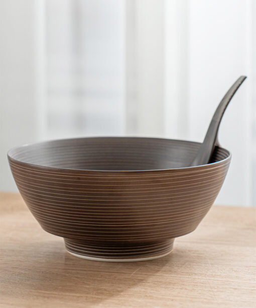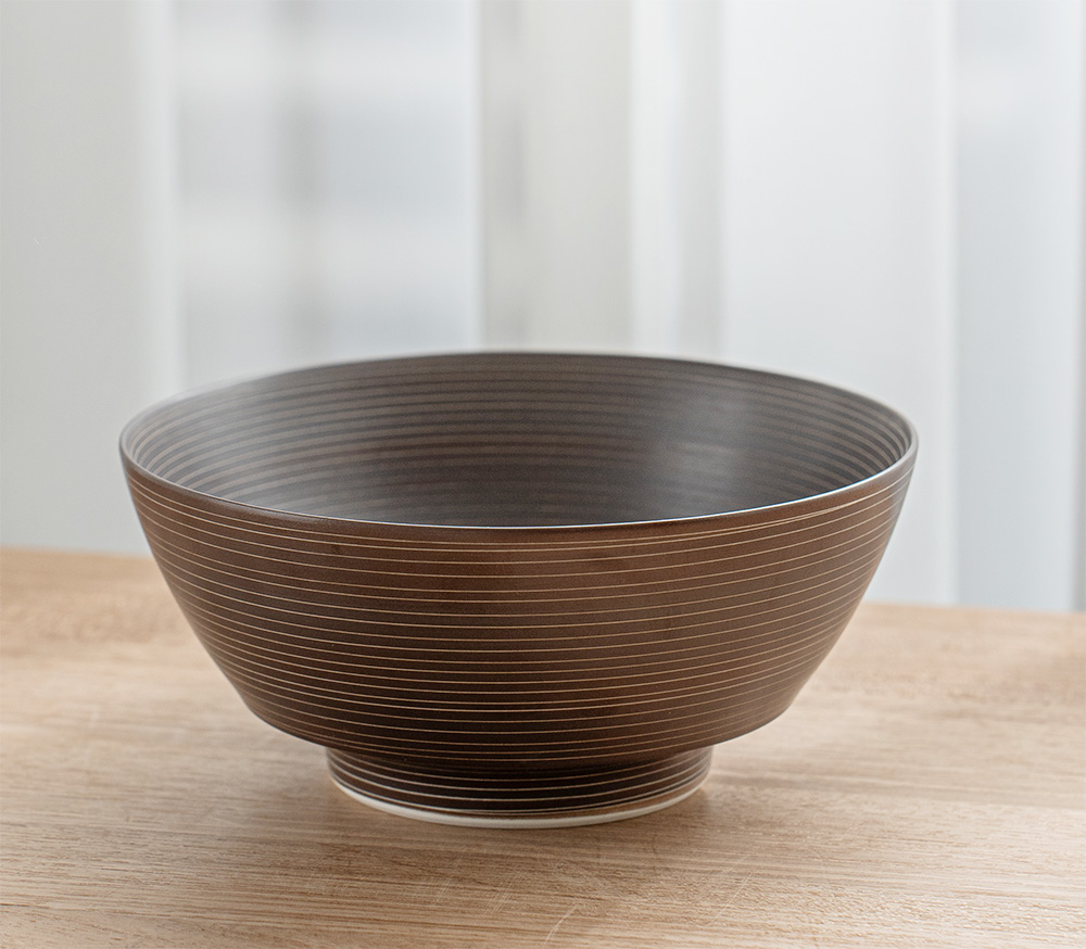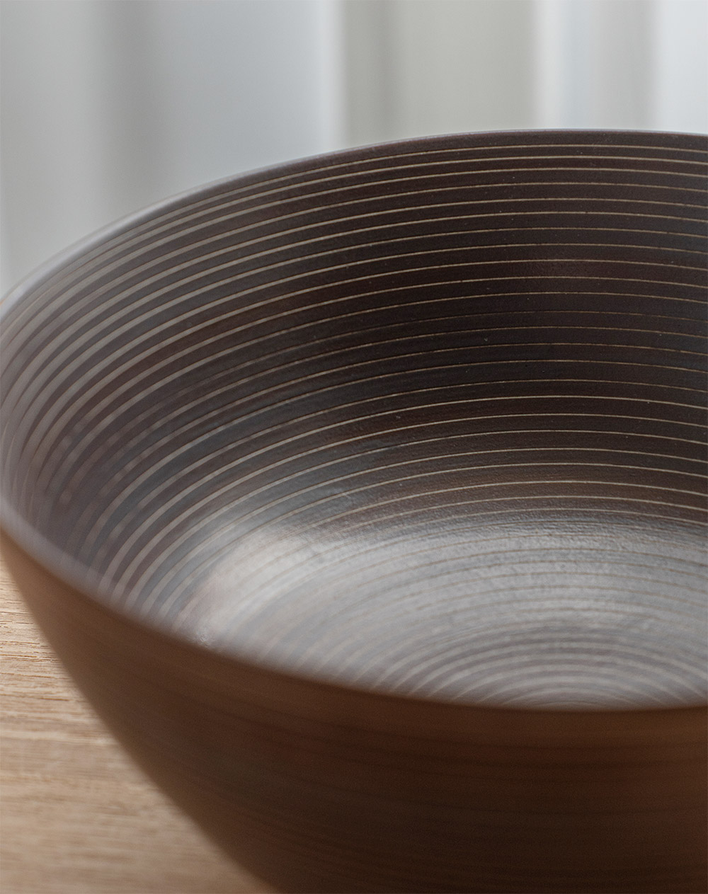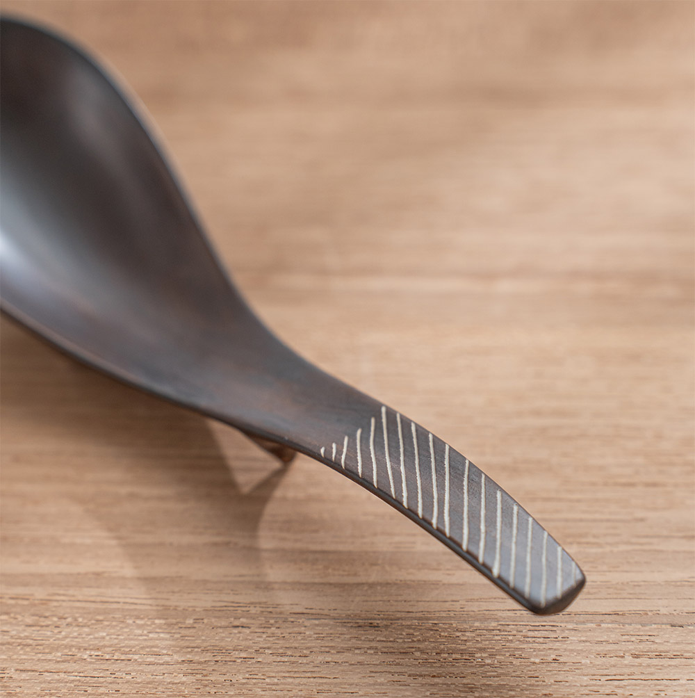 錆千段 究極麵碗湯匙組合,是由李莊窯所製作。以含鐵量高的鐵鏽釉,再用鐵筆刻畫線紋,隨著使用,會逐漸呈現出類似漆器般的質感與色澤。簡約洗練的「 錆千段」系列尤其受到歡迎,能為餐桌增添時尚感。