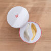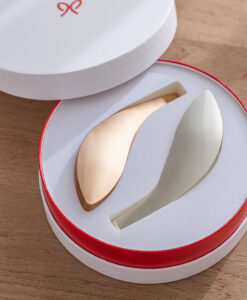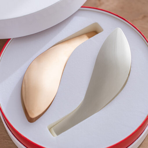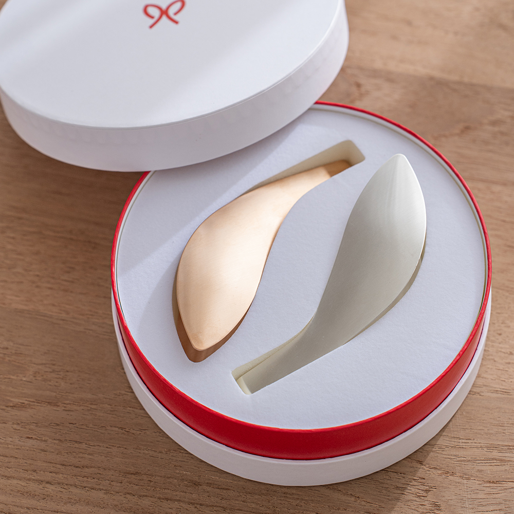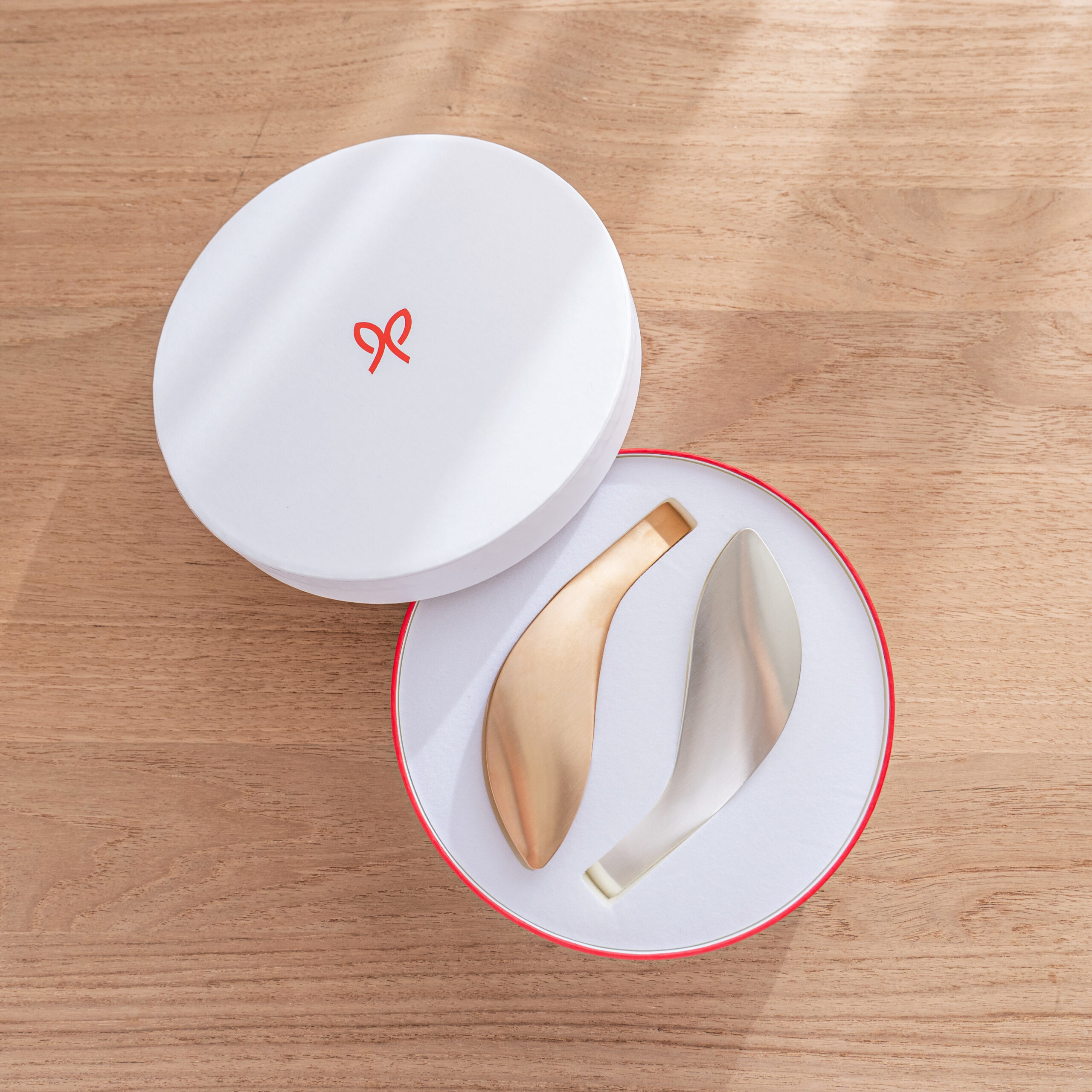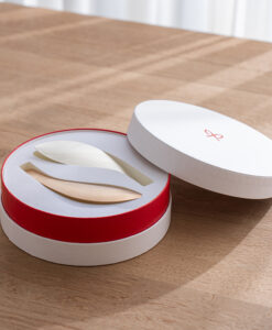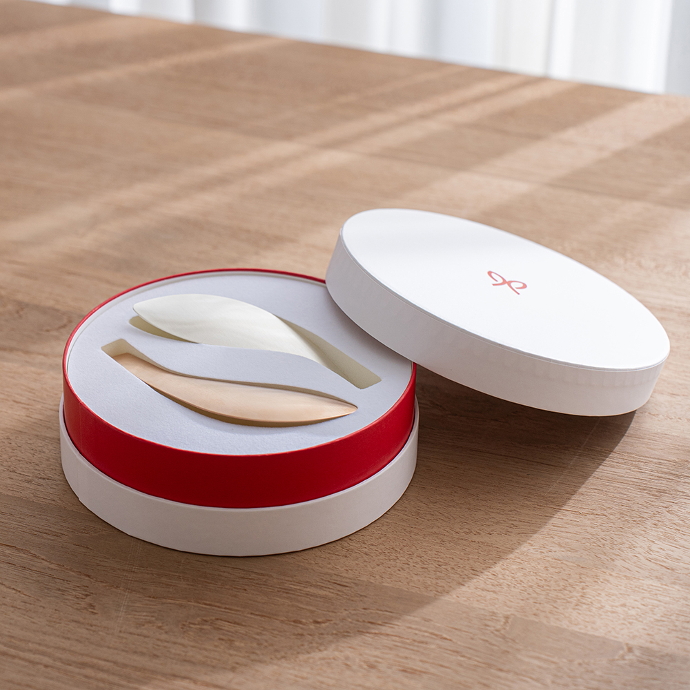 線條圓潤的圓形禮盒,蘊含著「圓滿、幸福」的祝福心意,非常適合作為贈禮。盒蓋闔上後,看起來宛如象徵緣分的「紅線」,也是這款包裝的一大亮點。