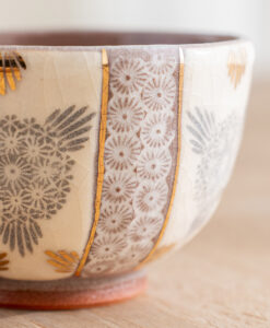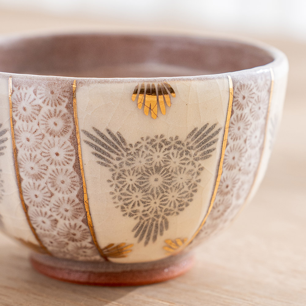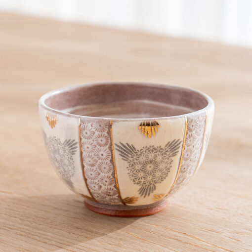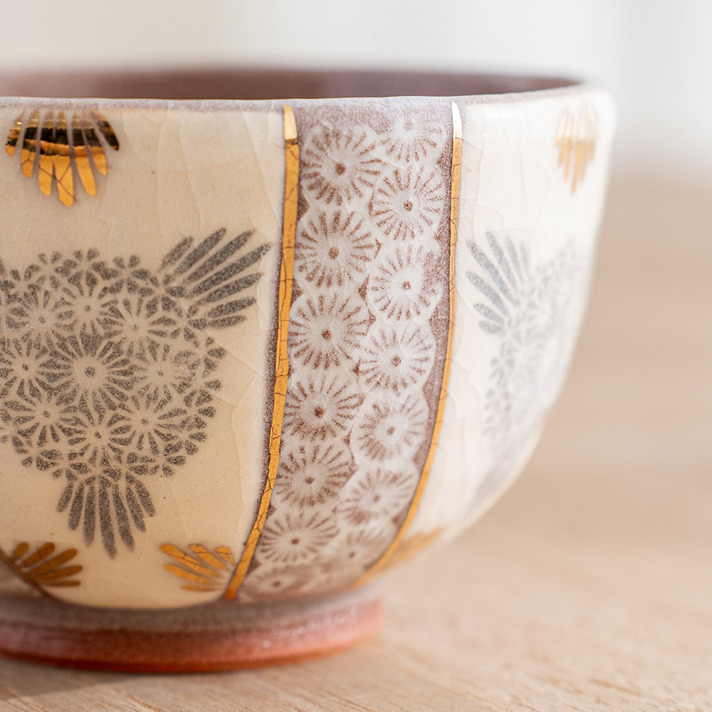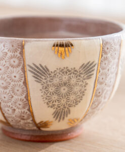 京都名店 西川貞三郎商店(1917年創立),志野花三島系列商品完美結合志野燒的溫潤及三島手的精緻,器皿表面帶著如和服布料般的細膩紋理,並輔以細緻的花朵壓紋裝飾,茶碗上點綴金彩裝飾,更顯華麗與精緻,結合了傳統陶瓷技法與現代美學,展現出沉穩且華麗的風格,賦與京燒更有活力的現代風貌。