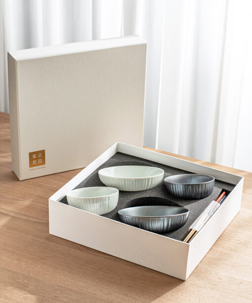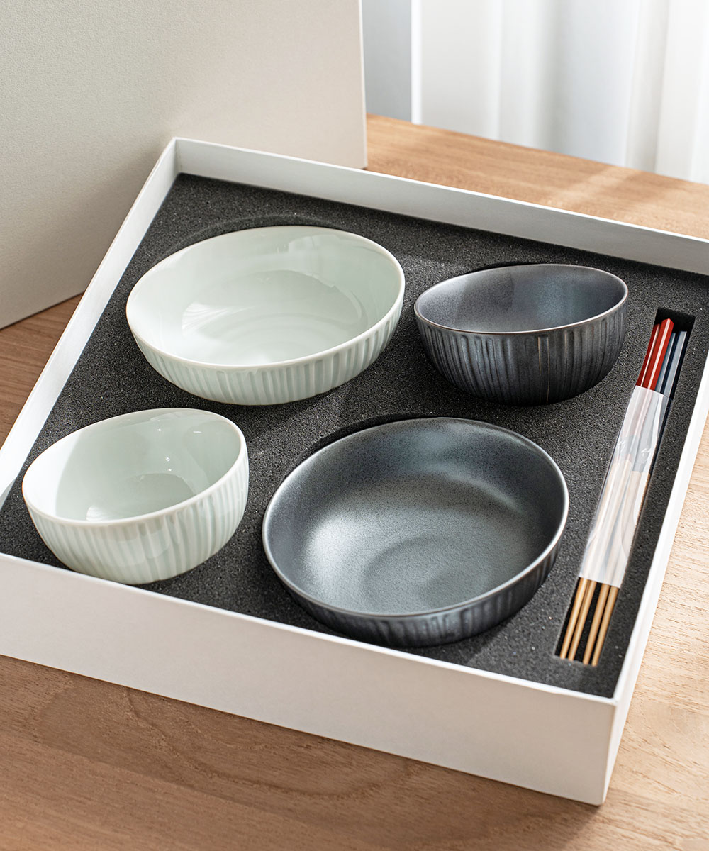 【禮盒內容】淺缽2件(黑白各一)、飯碗2件(黑白各一)、竹筷2雙(陶紅色與藍色)
