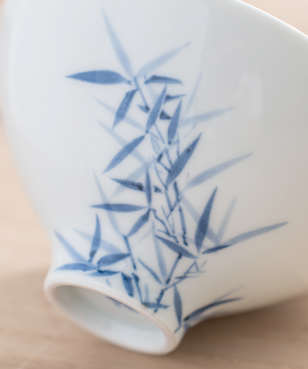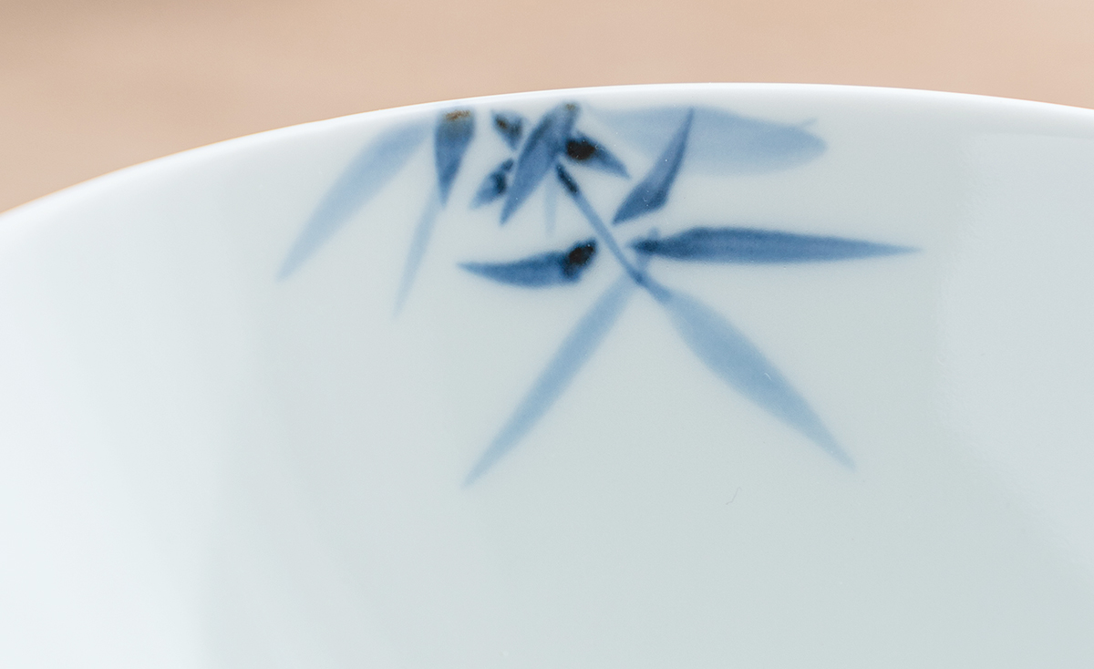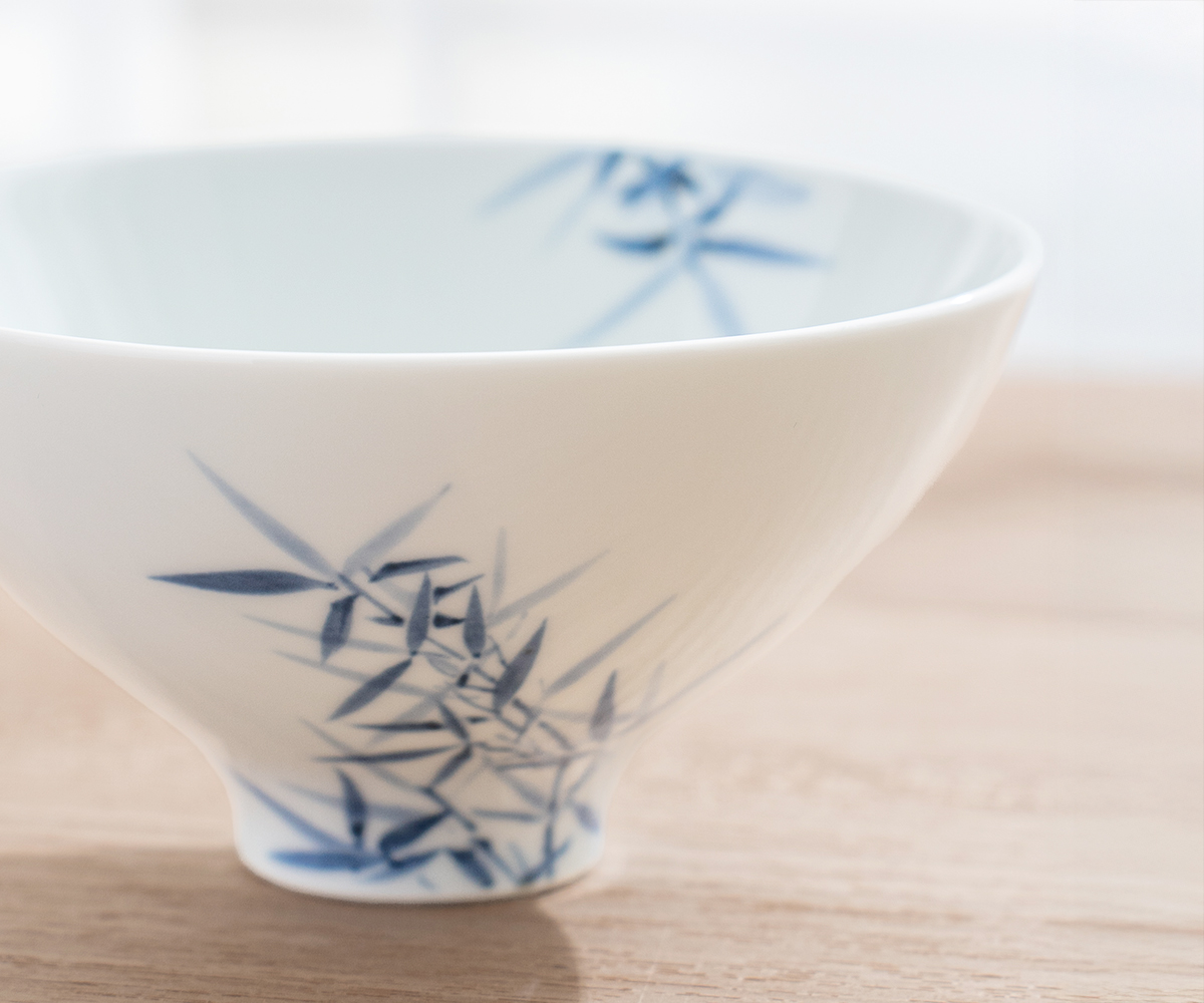 細膩手繪的生動飄逸竹葉,深淺相間的葉片,風雅有型,搭配雙飛的雀鳥,在碗身的四週。飯碗的每一面,都有著讓人陶醉的風景。