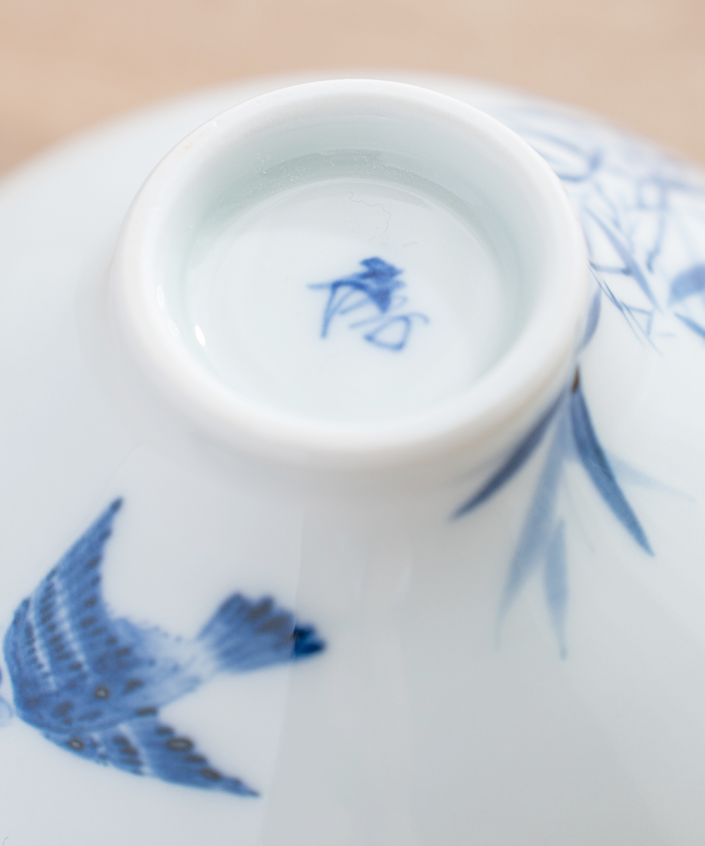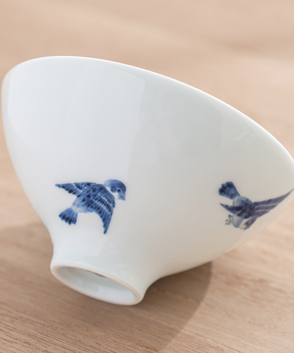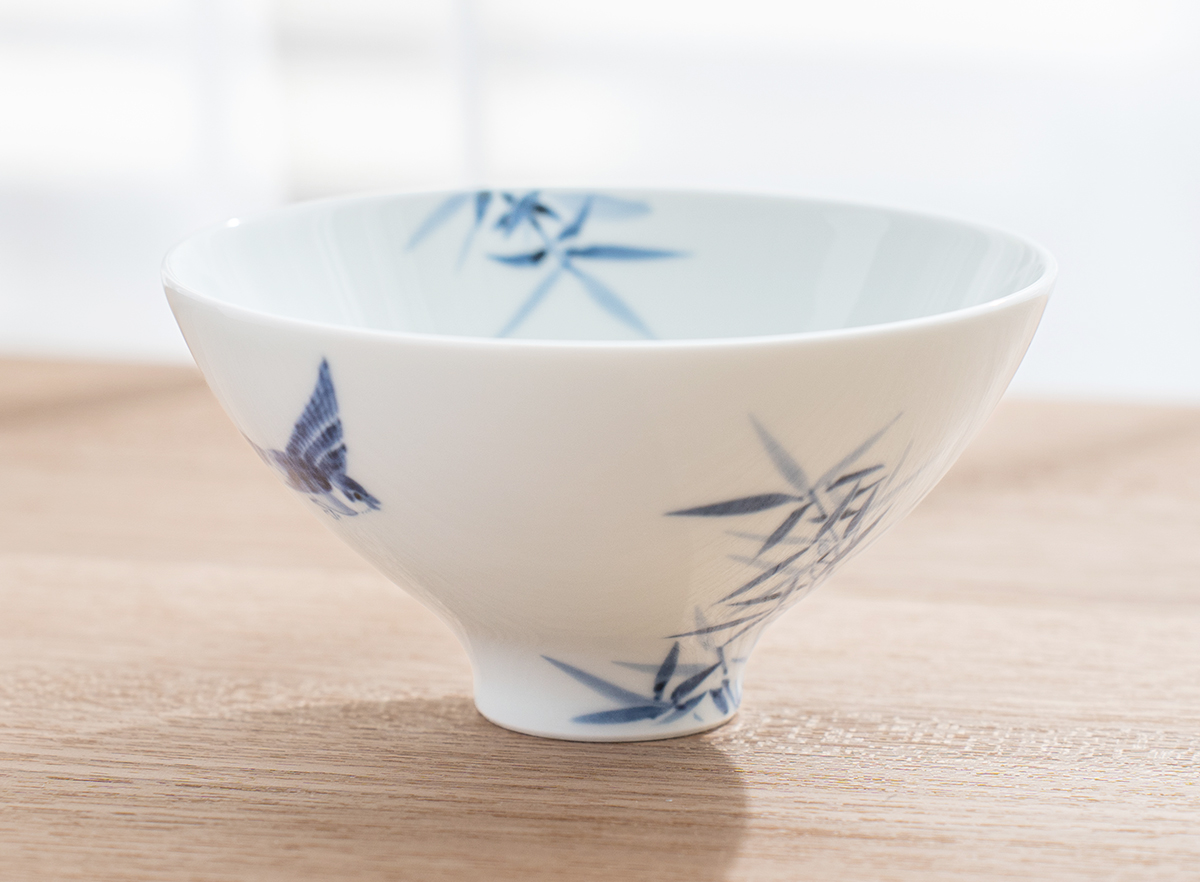 細膩手繪的生動飄逸竹葉,深淺相間的葉片,風雅有型,搭配雙飛的雀鳥,在碗身的四週。飯碗的每一面,都有著讓人陶醉的風景。