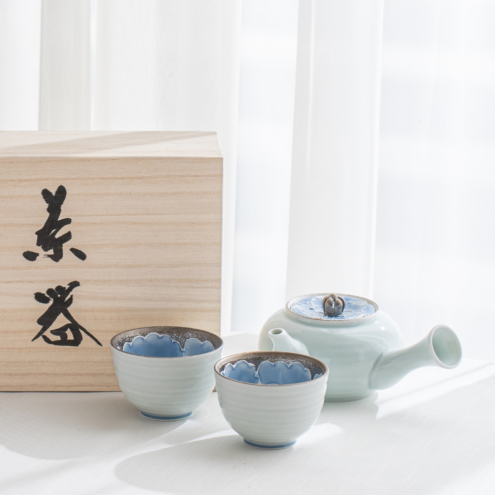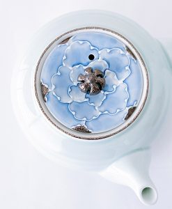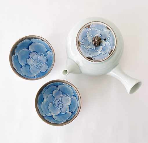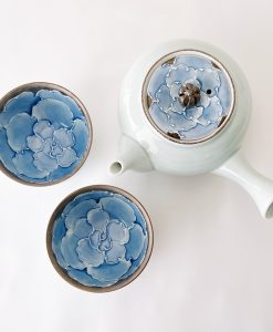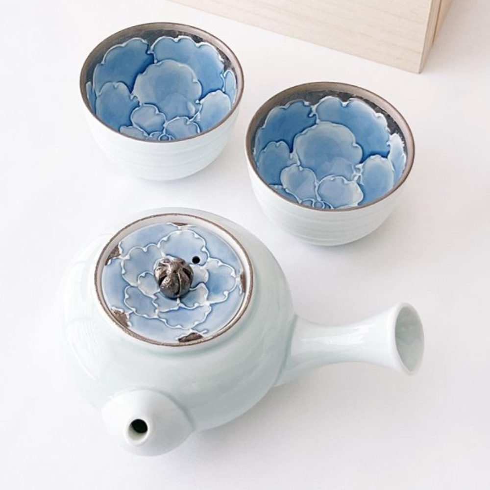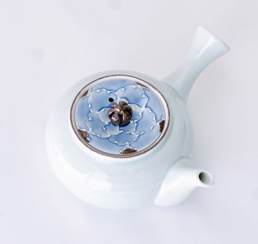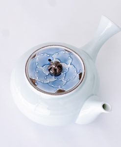 這款美麗的日式茶壺使用了山茶花圖案,結合有田燒和銀彩技術呈現。漸層染付的淡藍釉彩與銀色釉彩巧妙結合,呈現出淡雅的風格茶壺組。茶壺內有蜂巢,單柄急須壺的使用有其方便之處。