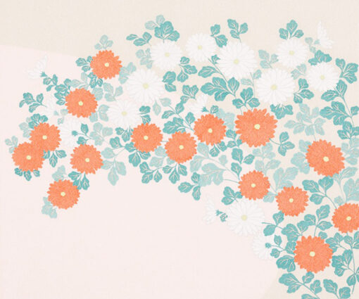 以象徵長壽的「菊花」與寓意災厄遠離的「流水」為靈感,融合為兼具優雅與祝福寓意的經典設計。從細膩的友禪染圖樣中,可感受到四季流轉的自然之美,彷彿一幅隨手展開的和風畫作。
