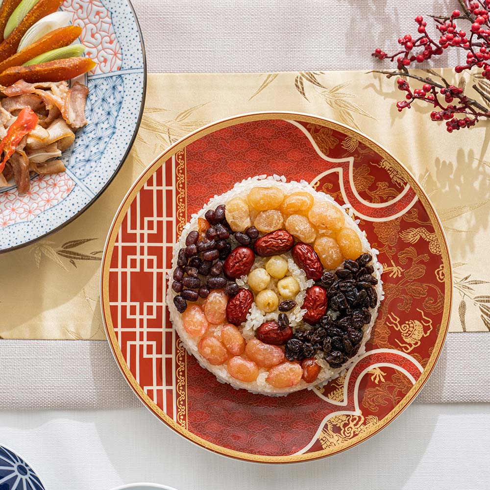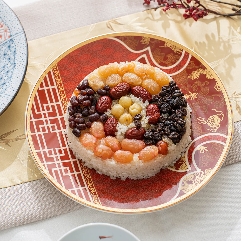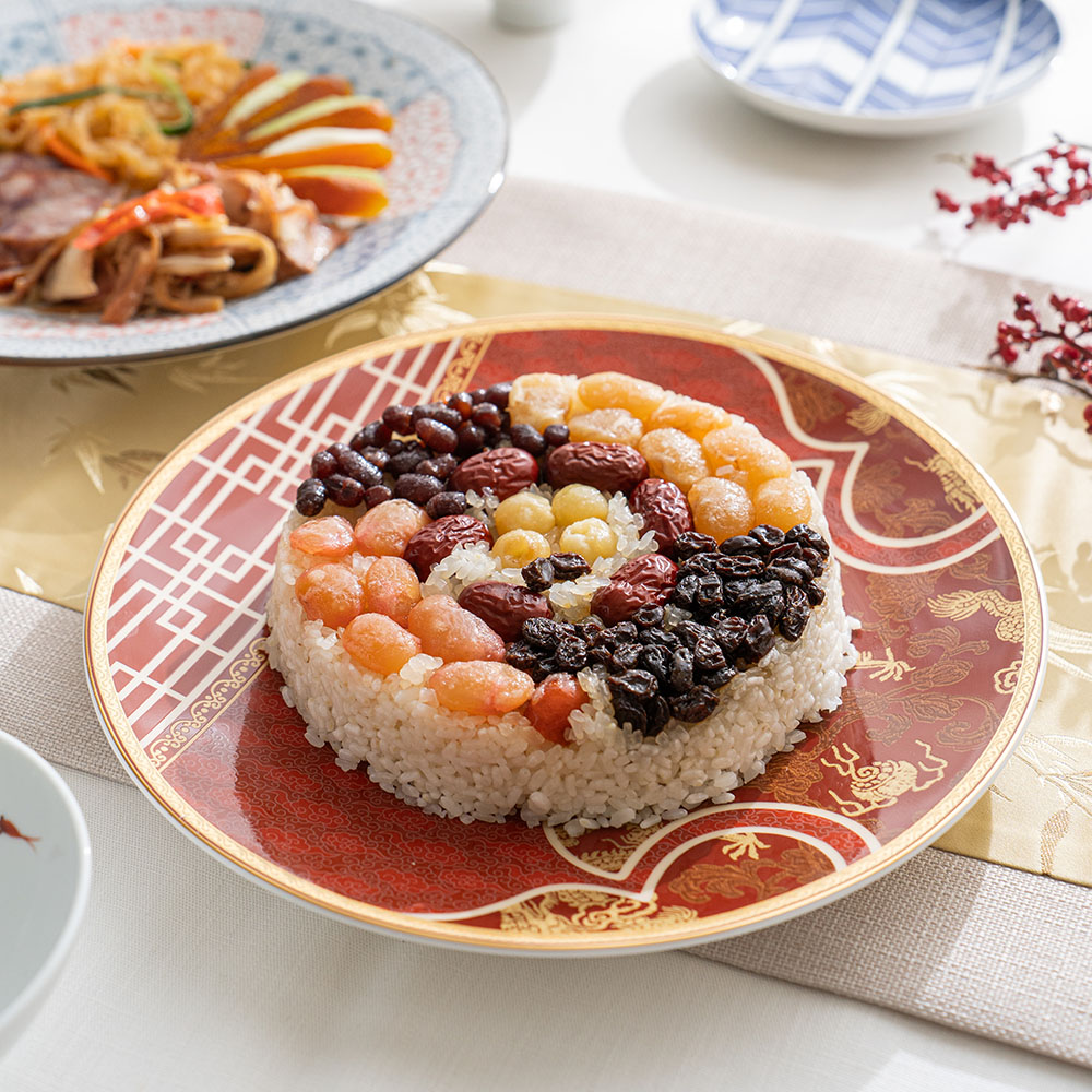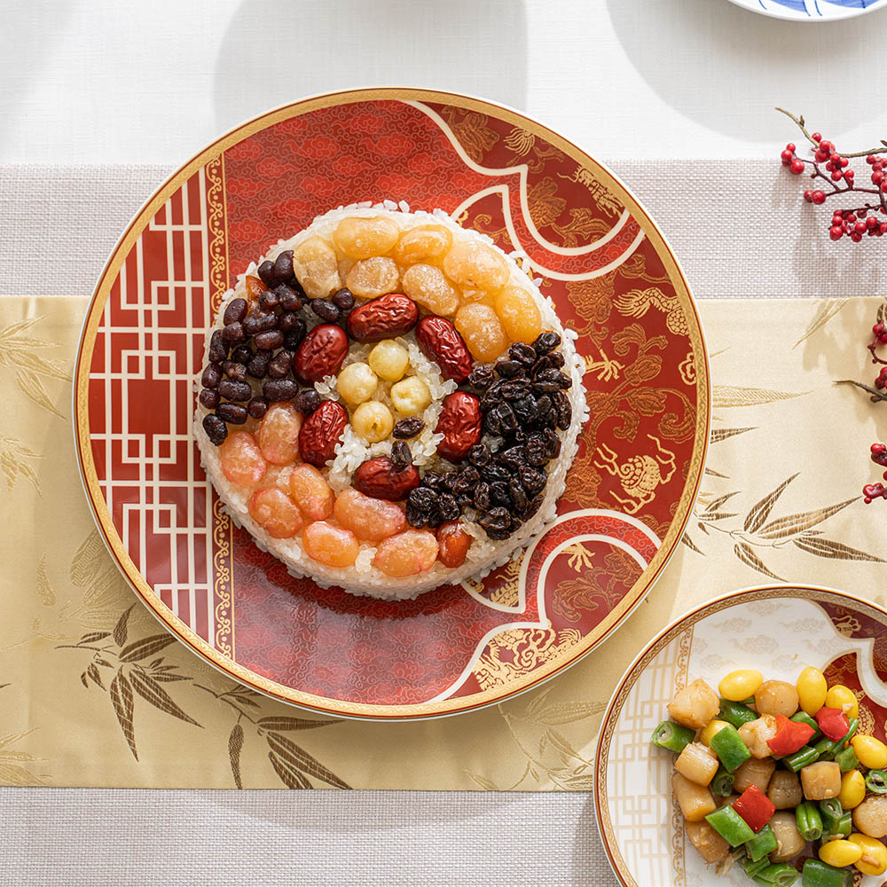 盤底有著細緻的瑞雲圖紋,搭配盤面的龍、牡丹..等主題,以及多樣的金彩線條勾勒,賦予華麗而不失品味的印象。是新年期間或重要宴客場合時,體面而實用的27cm大盤,帶著2.7cm的深度,特別適合中式料理的盛盤。