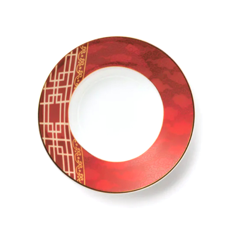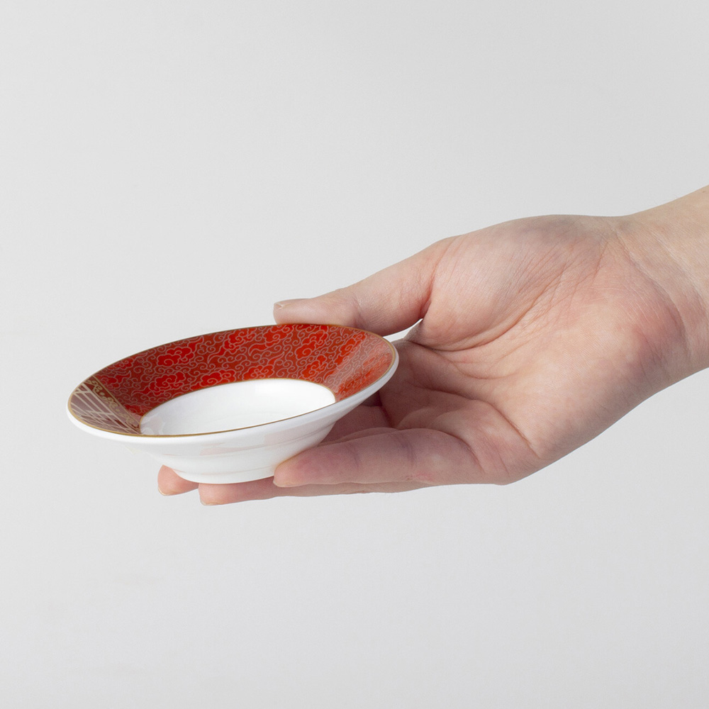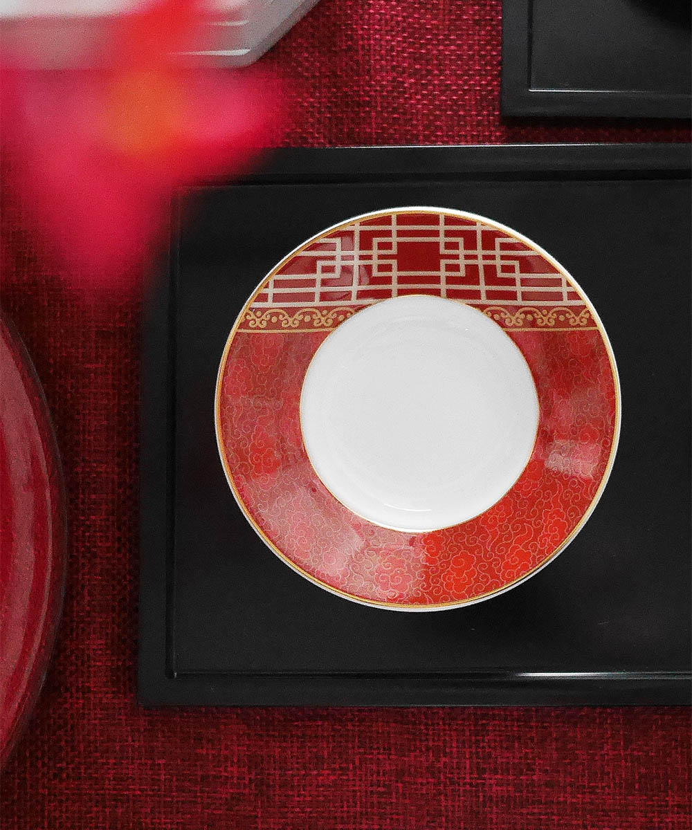 現代感風格的紅金系列,盤緣有著金彩的雅緻瑞雲圖紋,特別適合新春時使用,吉祥而討喜。作為茶托,可以襯出純白茶杯的質感。作為小碟,可放醬料小菜。