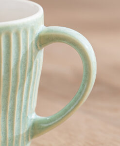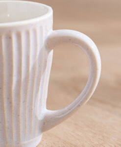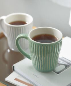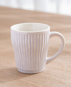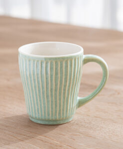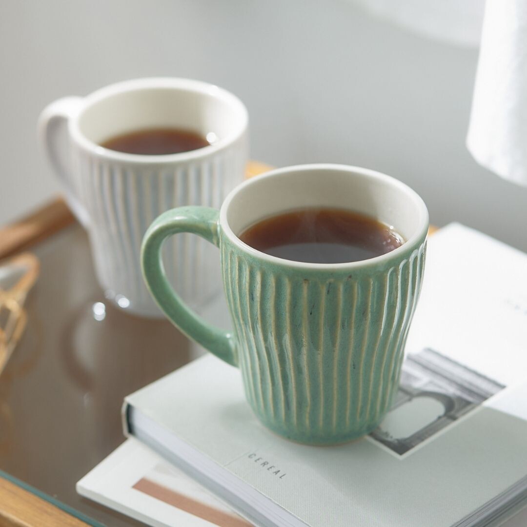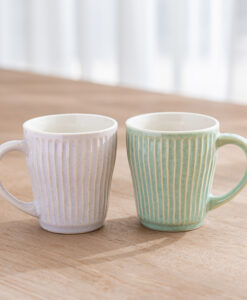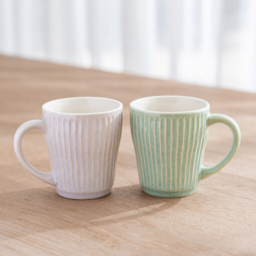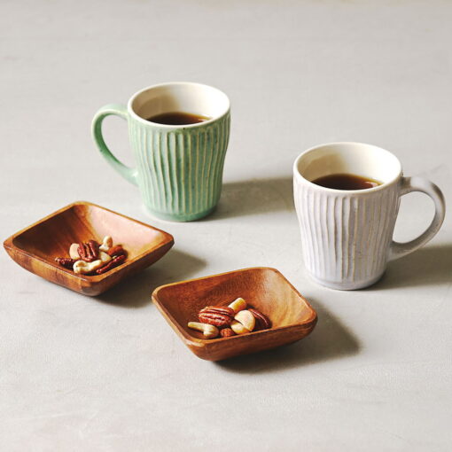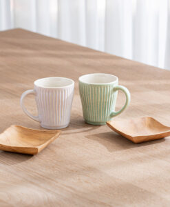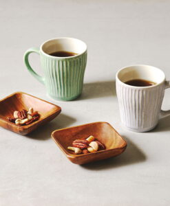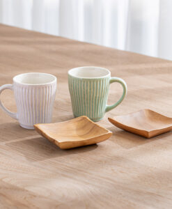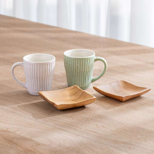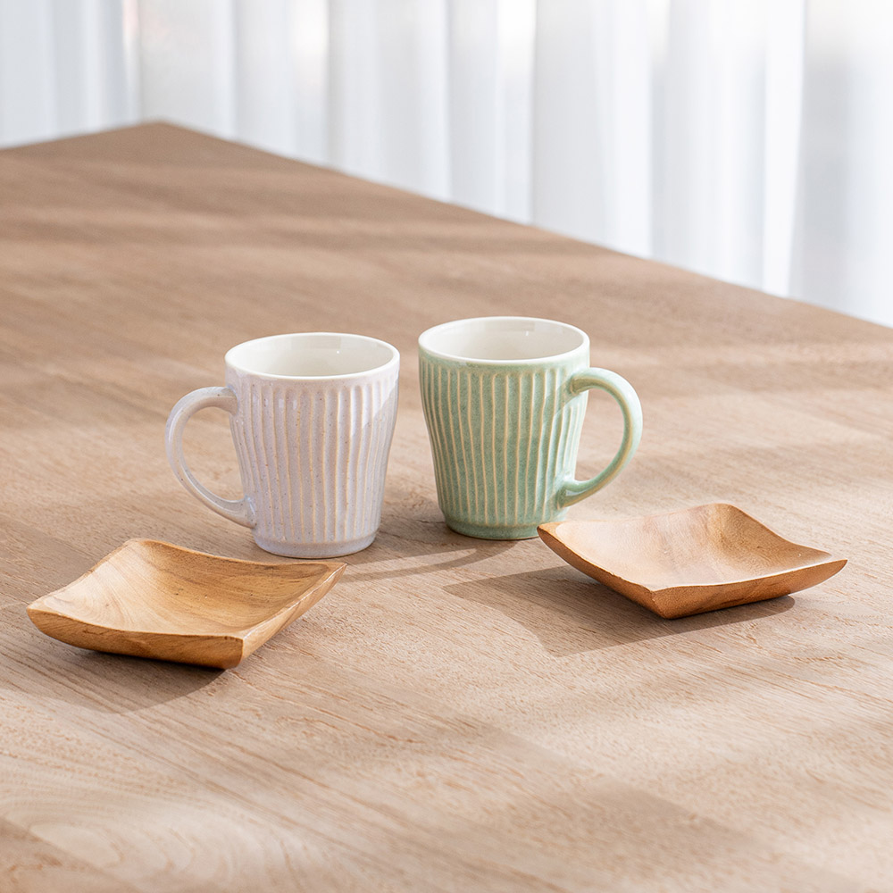杯身表面擁有如漣漪般的立體刻痕,不僅視覺上具有光影層次,握持時更能感受到細膩的陶土質感,隨附兩枚厚實的天然木托盤,除作為杯墊,也適合單獨盛放手工餅乾或小點心,結婚賀禮、新居落成禮物均十分推薦。