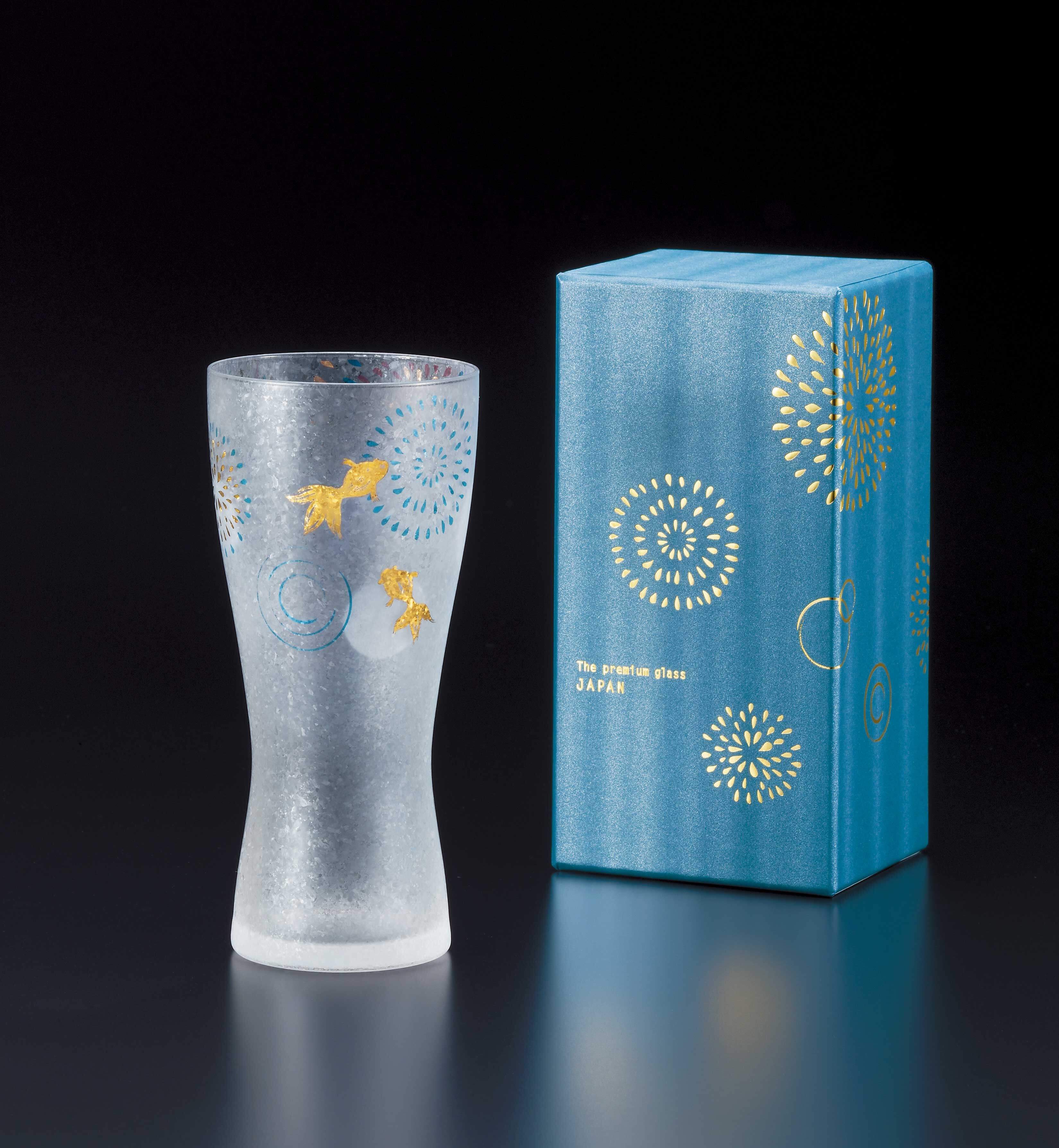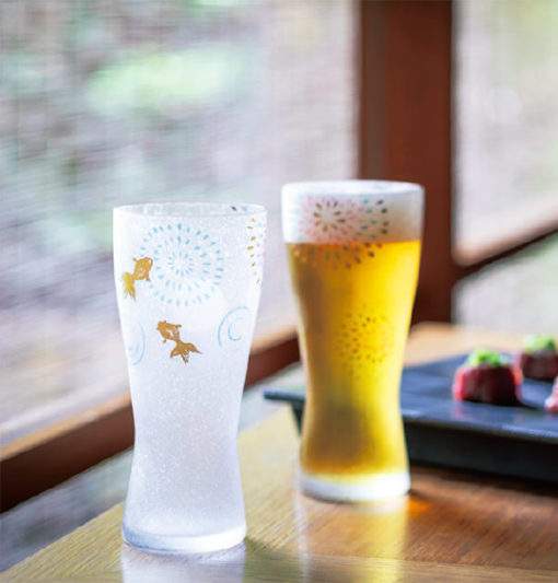 在水面上映出令人開心的夏日煙火,搭配跳躍出水面的金魚日式紋樣,是十分討喜的設計款式。特殊的霧面結晶玻璃,及杯身內部弧度的設計,在倒入啤酒時,能產生更綿密的泡沫。為享用啤酒的樂趣,進一步升級。