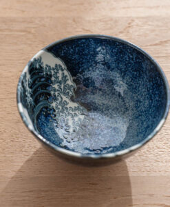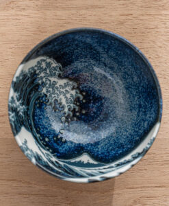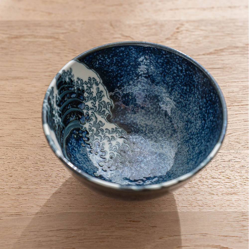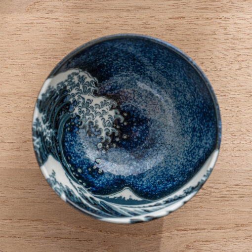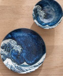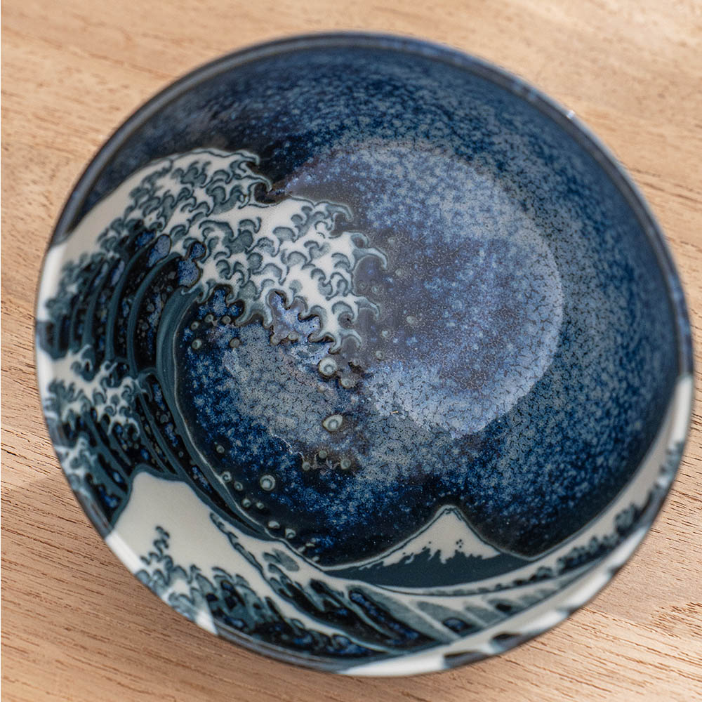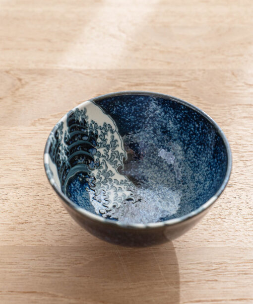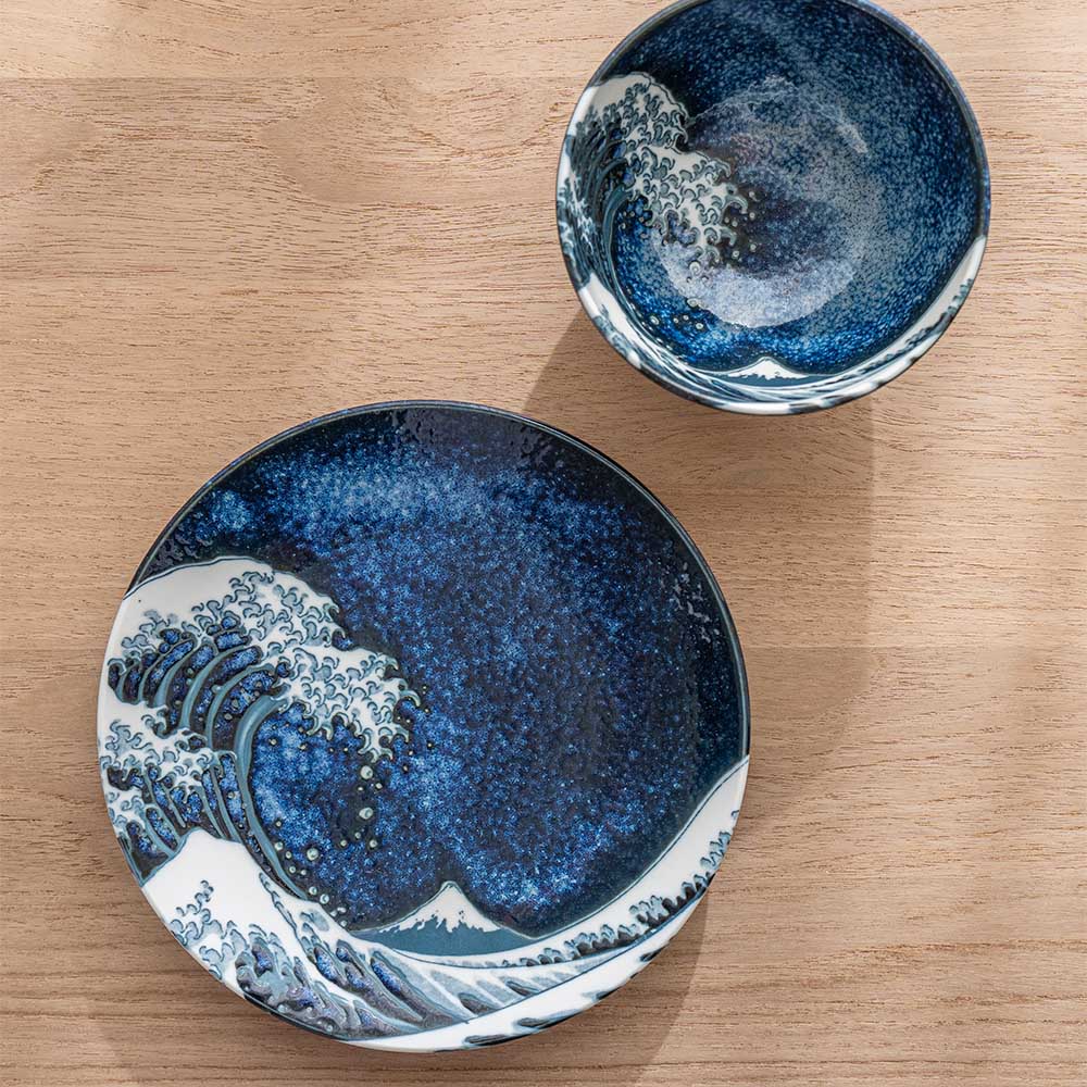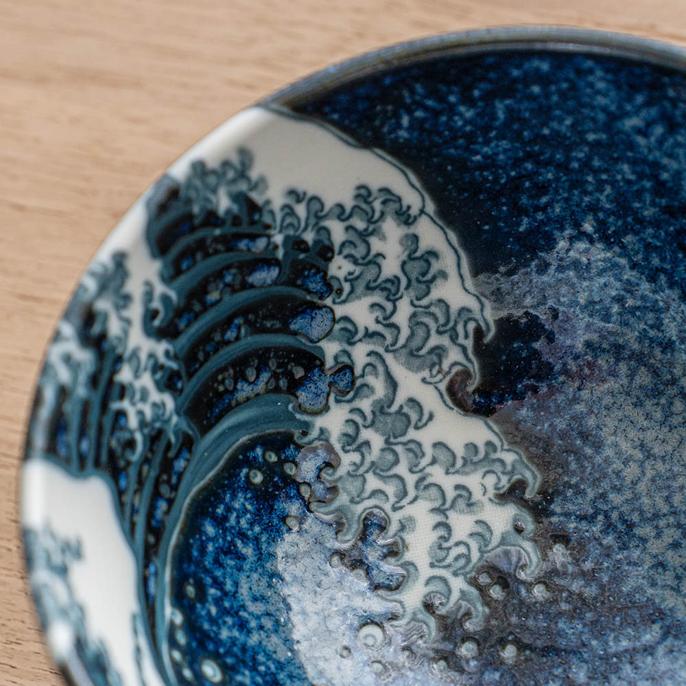 將藝術之美注入日常餐桌,碗身內側以深藍渲染波光粼粼的質感,並巧妙描繪翻騰海浪的動感筆觸,細緻如版畫般的紋理,彷彿每一次用餐都與浮世繪相遇。無論盛裝飯食、甜品或湯品皆宜,既適合日常使用,也適合作為贈禮。推薦搭配相同系列的圓盤,打造具藝術感的餐桌風景。