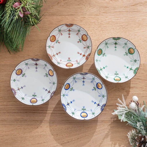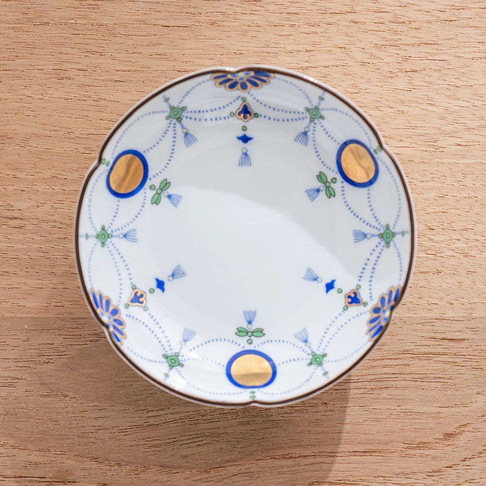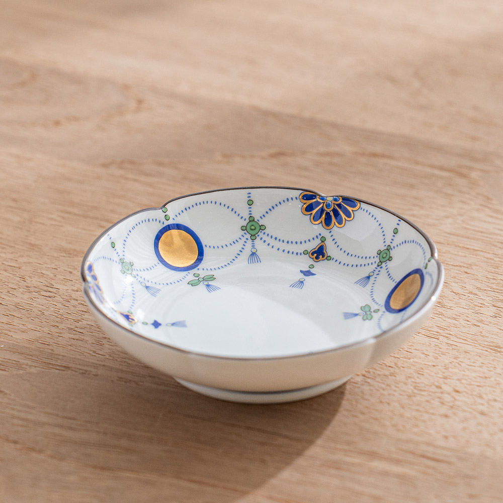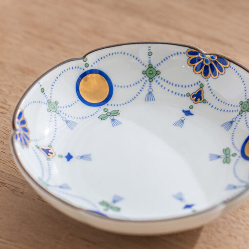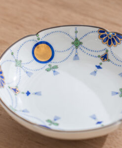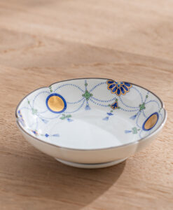 「瓔珞文」是以日式經典圖紋之一,以寶石和珍珠等飾品編織而串起成優雅的圖樣,象徵富貴之意。此款瓔珞文點心盤,以藍,金,綠三色,妝點出溫柔典雅的盤面,是接待客人使用的美麗小盤。