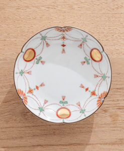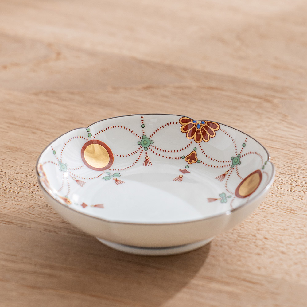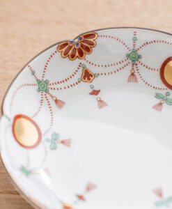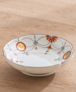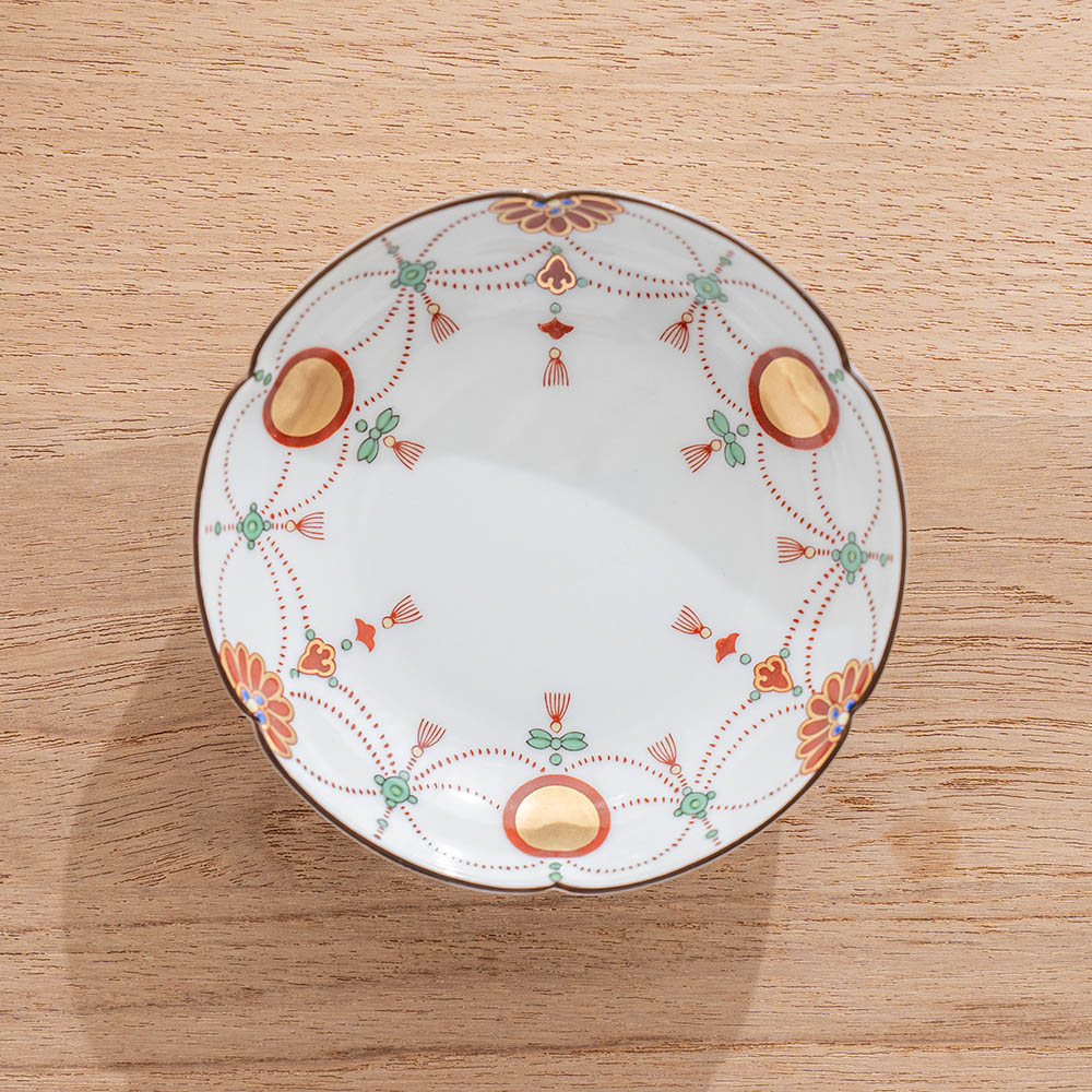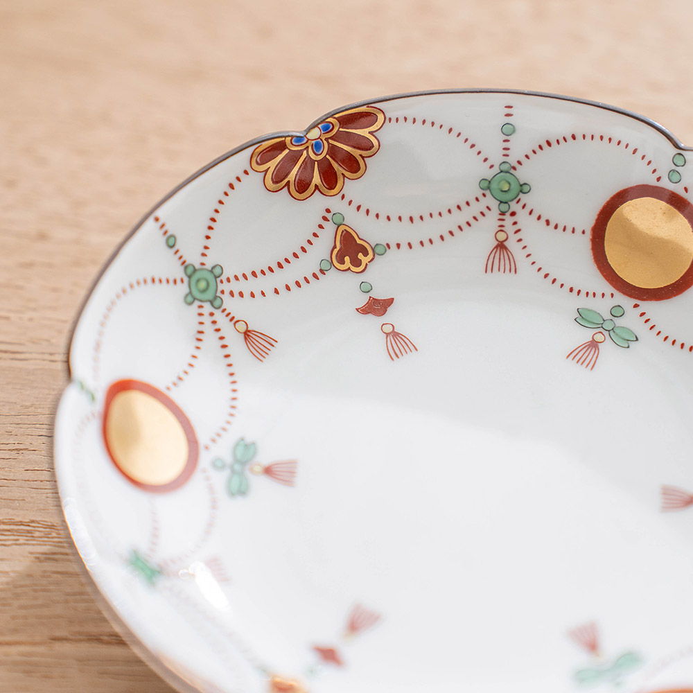 「瓔珞文」是以日式經典圖紋之一,以寶石和珍珠等飾品編織而串起成優雅的圖樣,象徵富貴之意。此款瓔珞文點心盤,以紅,金,綠三色,妝點出溫柔典雅的盤面,是接待客人使用的美麗小盤。