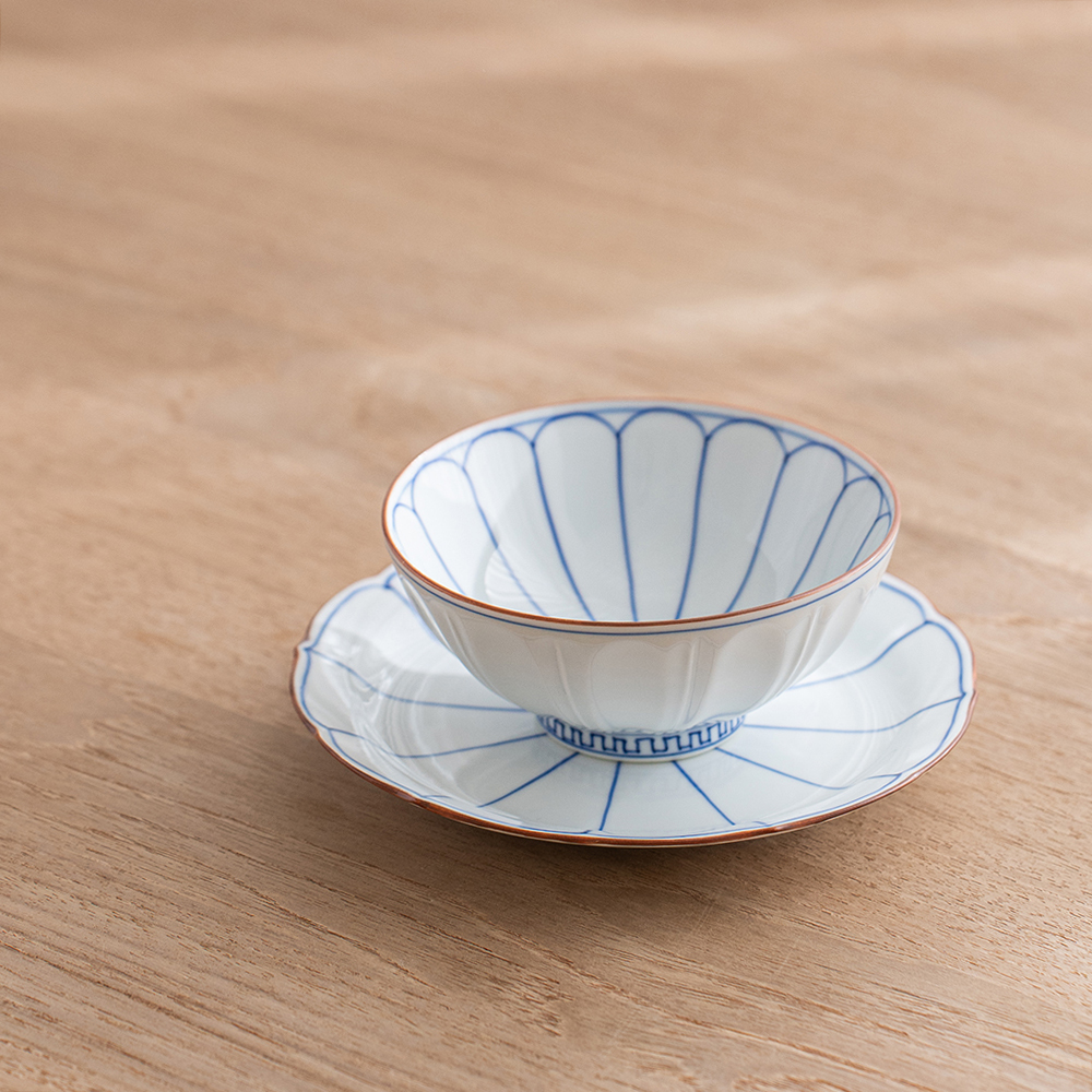 這組器皿以輕薄而潔白的瓷土為底,細緻手繪出層層綻放的菊花花瓣,展現出柔雅的立體感與光影之美。