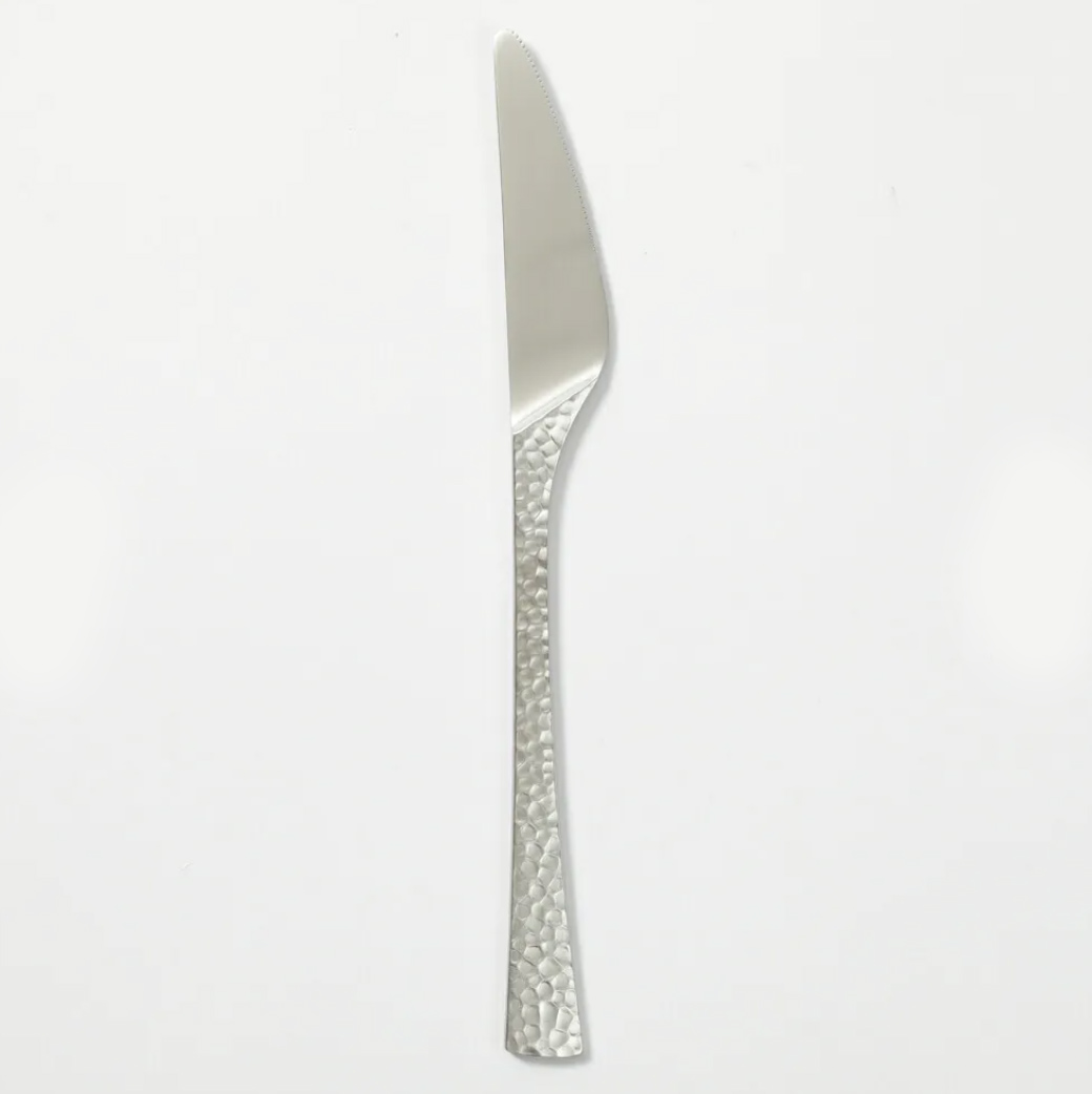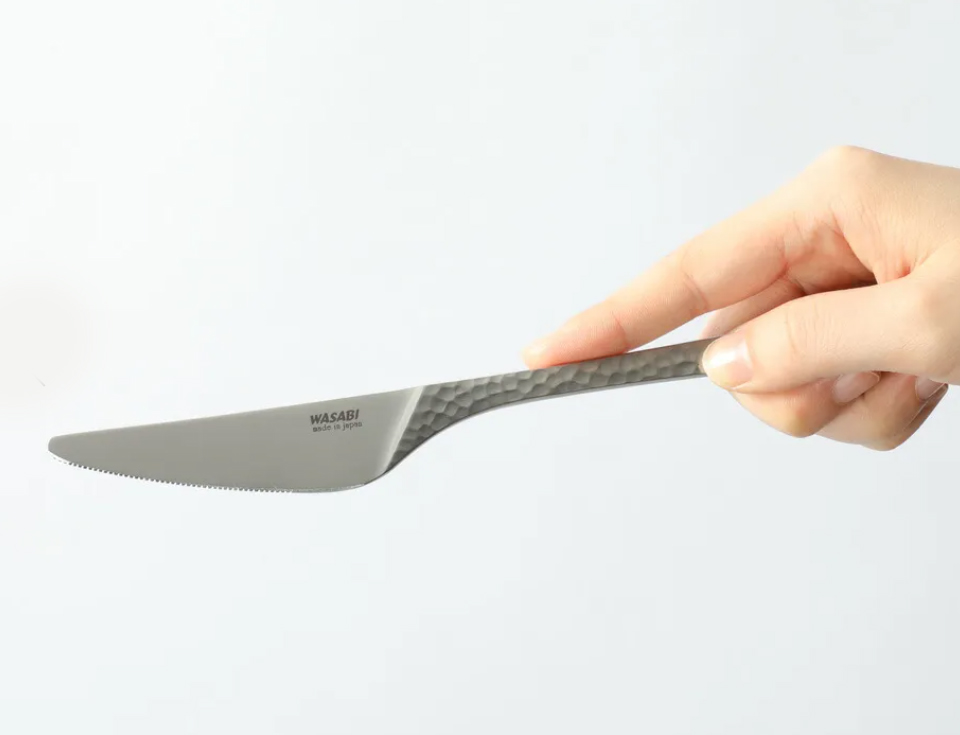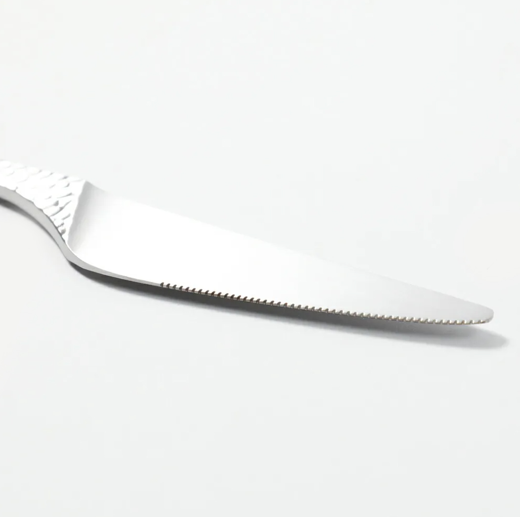 這是一款連柄部都施加鎚目工藝的餐刀,不僅展現日本職人精神,亦兼具實用性與美感,適合作為日常使用或贈禮之選。