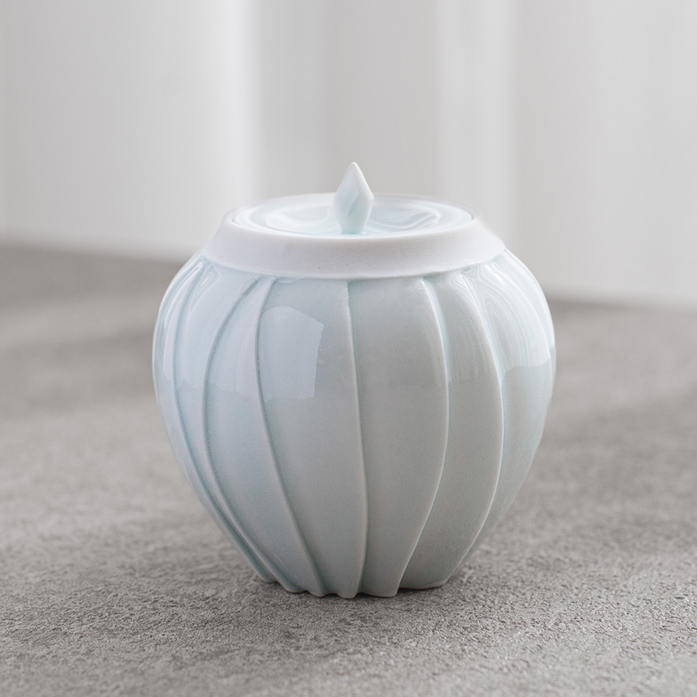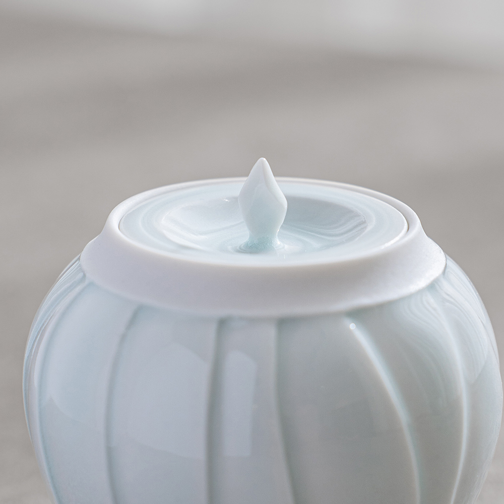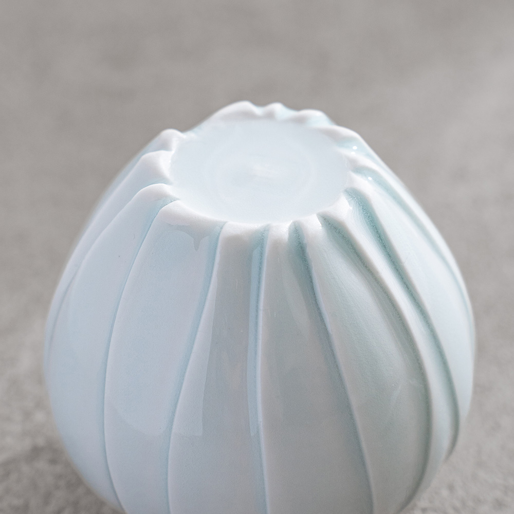 以含苞待放的花朵為靈感,作品呈現出圓潤而內斂的造型,柔和收束的輪廓,搭配細緻刻紋與青白釉的淡雅光澤,如同花苞靜靜佇立,在光影之中展現細膩而安靜的存在感。