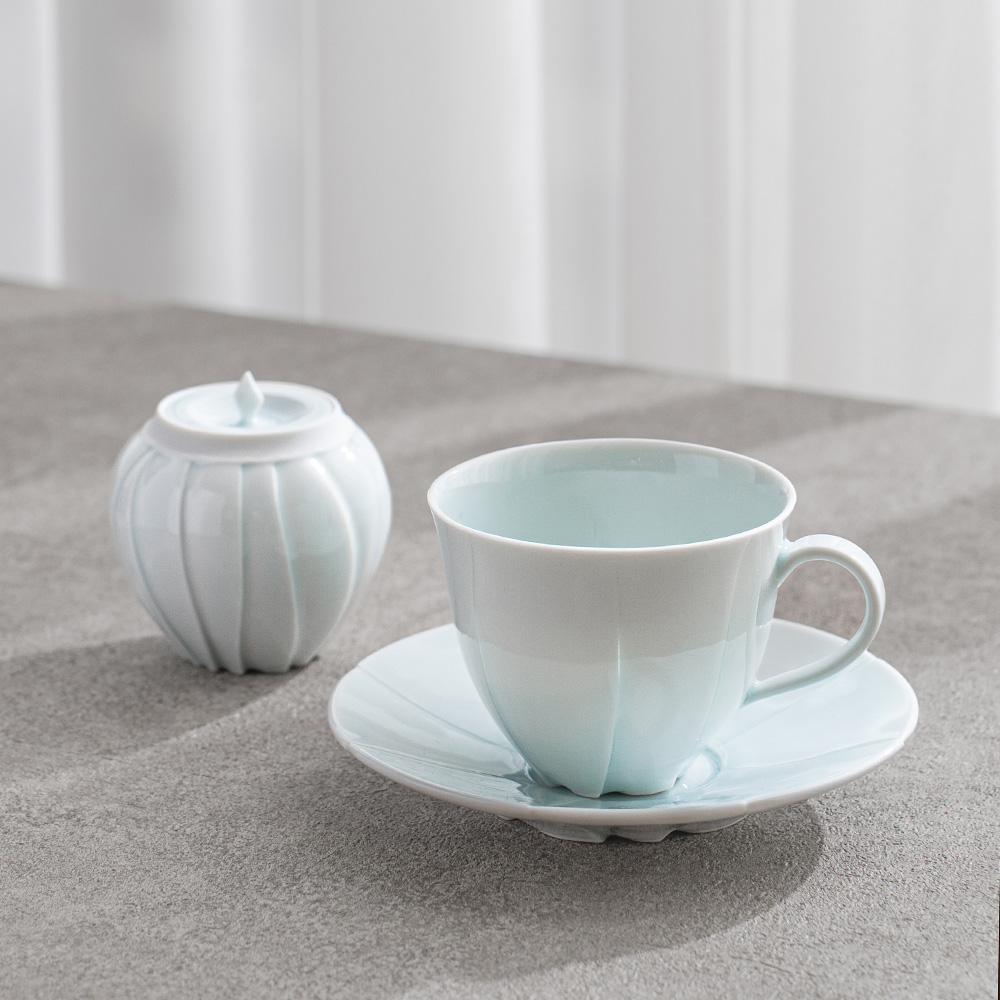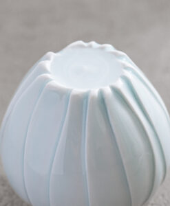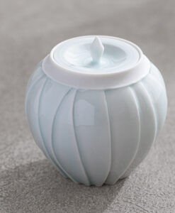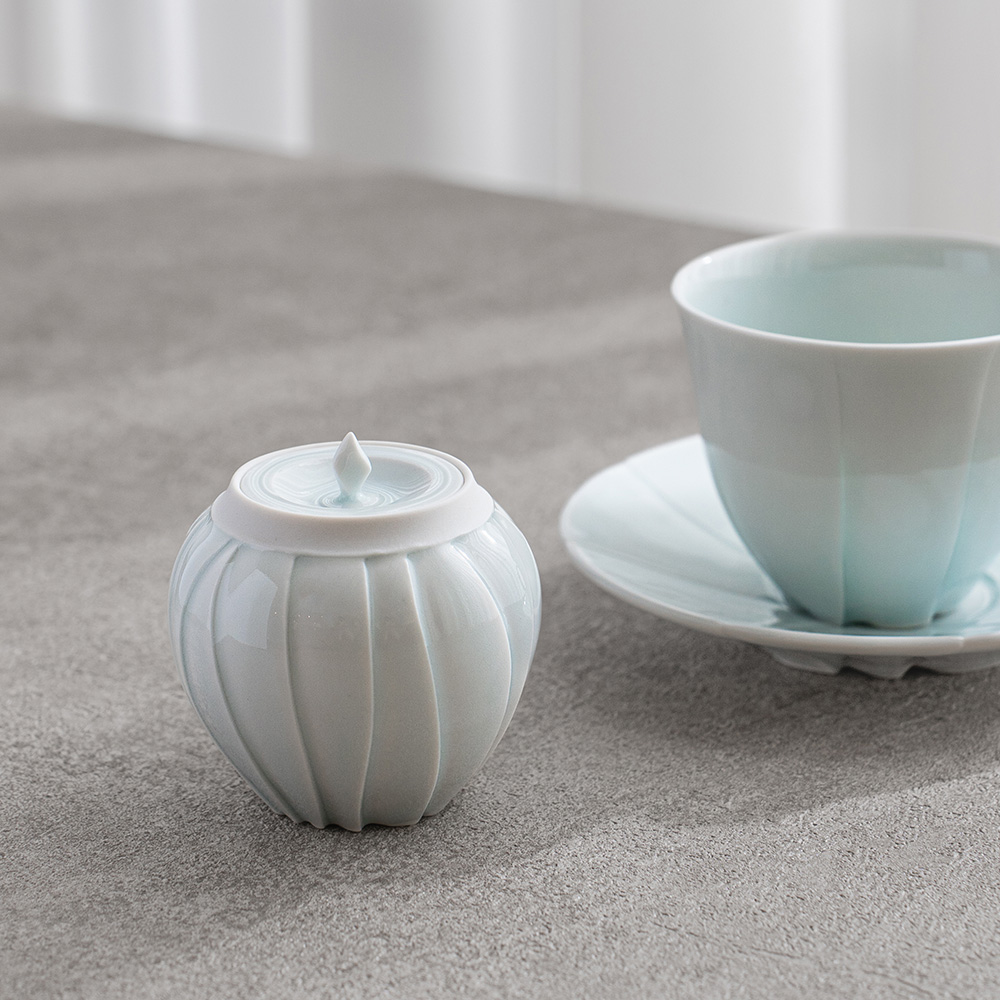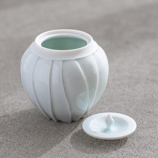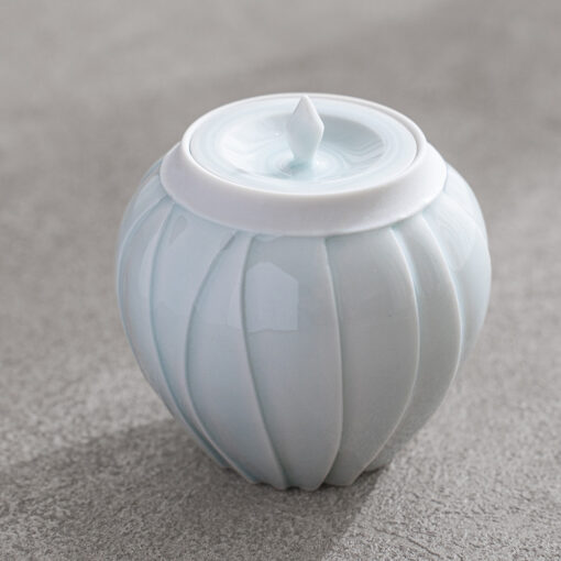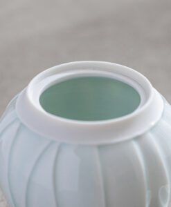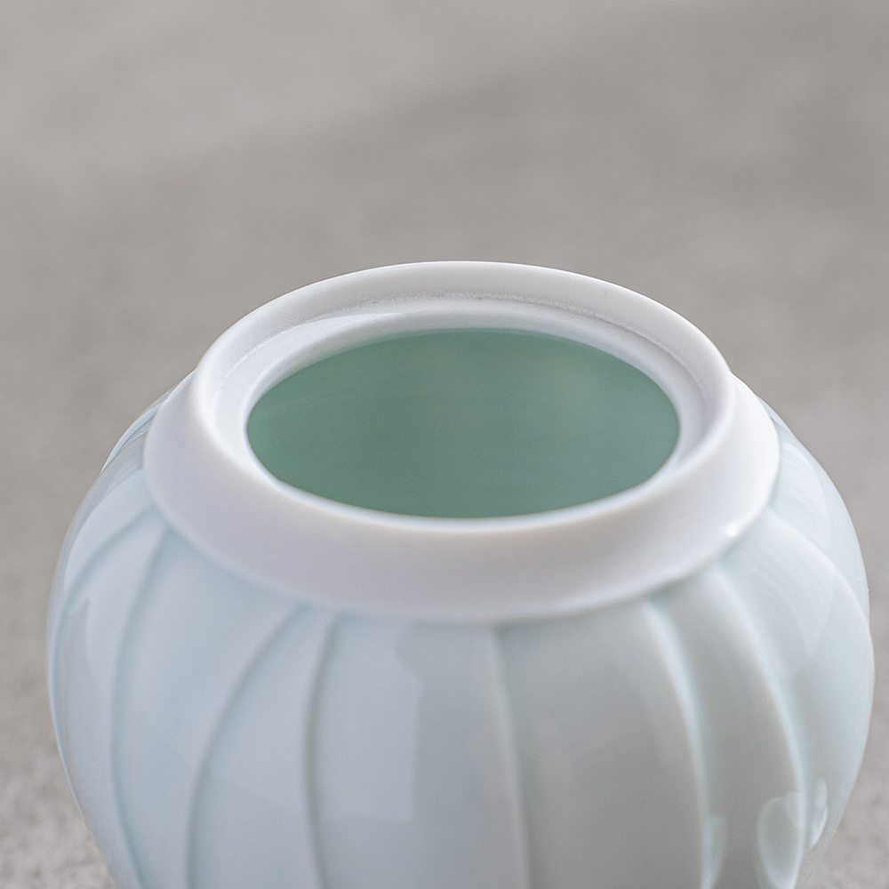 以含苞待放的花朵為靈感,作品呈現出圓潤而內斂的造型,柔和收束的輪廓,搭配細緻刻紋與青白釉的淡雅光澤,如同花苞靜靜佇立,在光影之中展現細膩而安靜的存在感。
