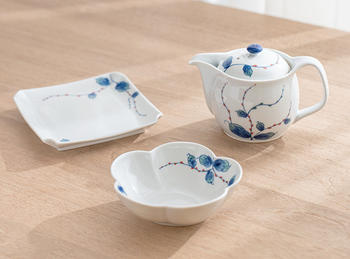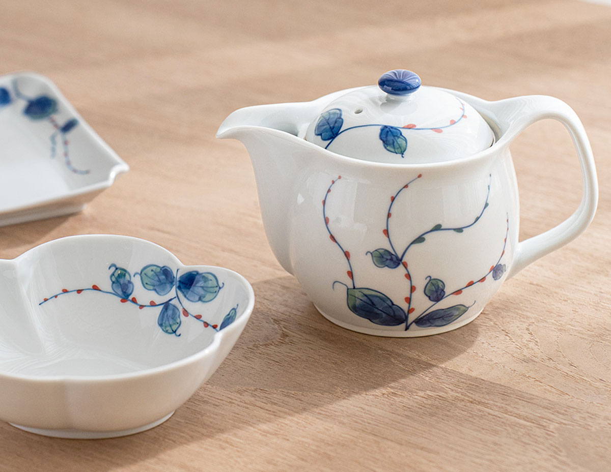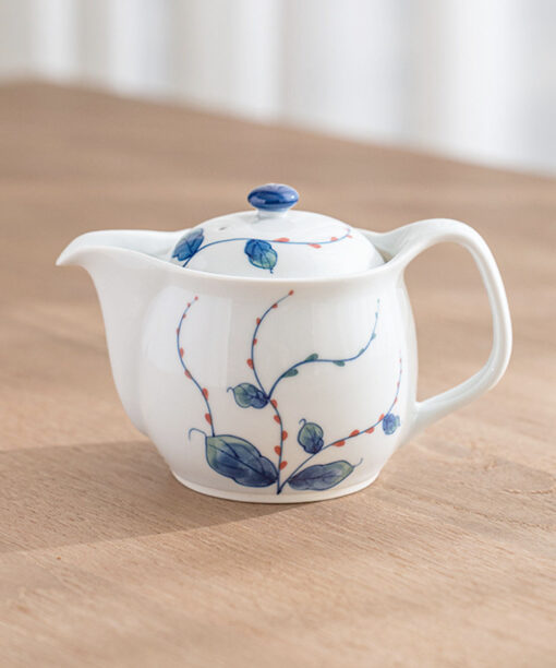這款水引草茶壺以純白瓷身為底,描繪出纖細優雅的水引草紋樣,線條婉轉柔美,葉片以藍綠暈染呈現,點綴橘紅色的花苞,彷彿將初秋微風中搖曳的野花凝於壺上。容量約250ml,適合1至2人靜享一壺好茶,無論是綠茶、紅茶或花草茶皆宜。