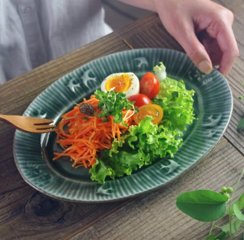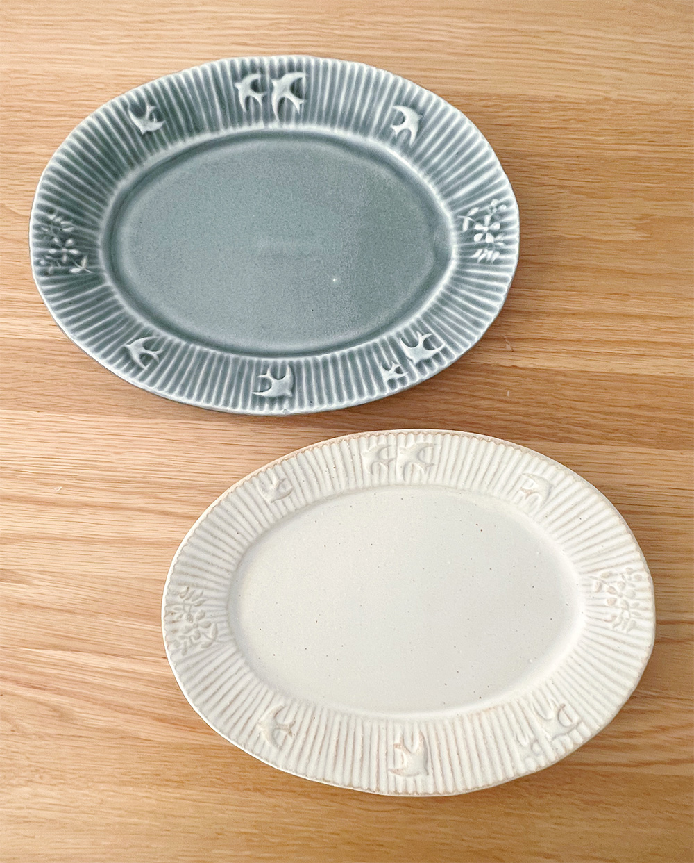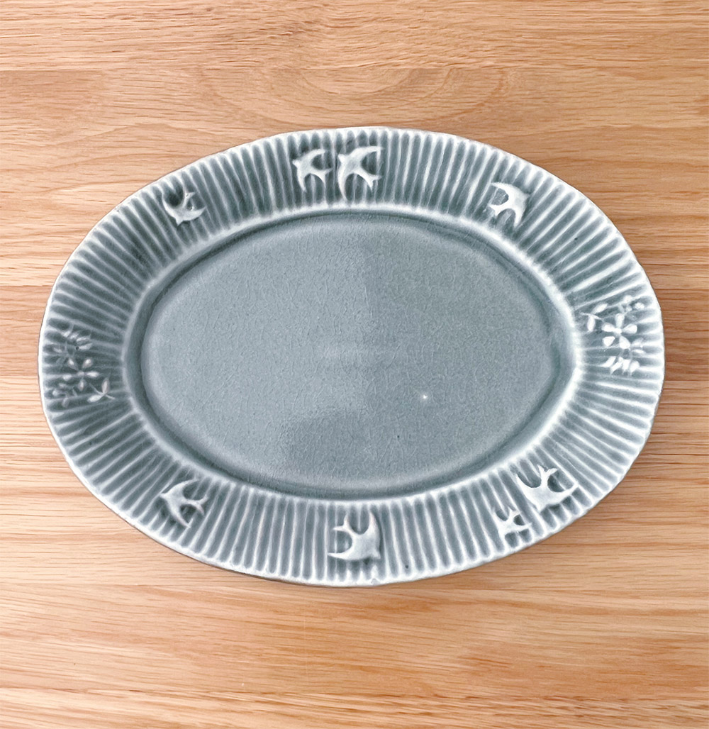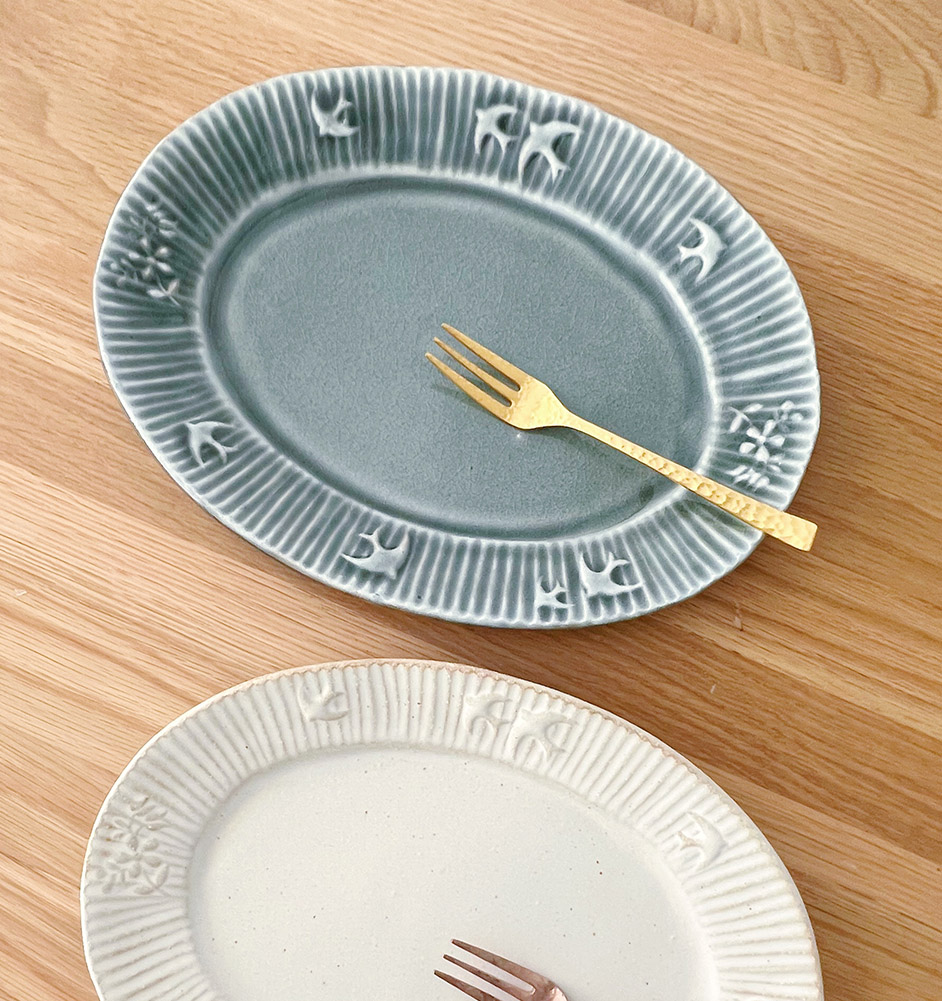 若林健吾益子燒的新系列作品,帶有可愛小鳥及花草,在線條盤緣上以浮雕圖案呈現。別緻的灰綠色釉料,自然而日常的氛圍,讓人感受到手工溫暖的作品。橢圓盤可以做為主菜盤或一個人用餐的個人盤,實用度極高。