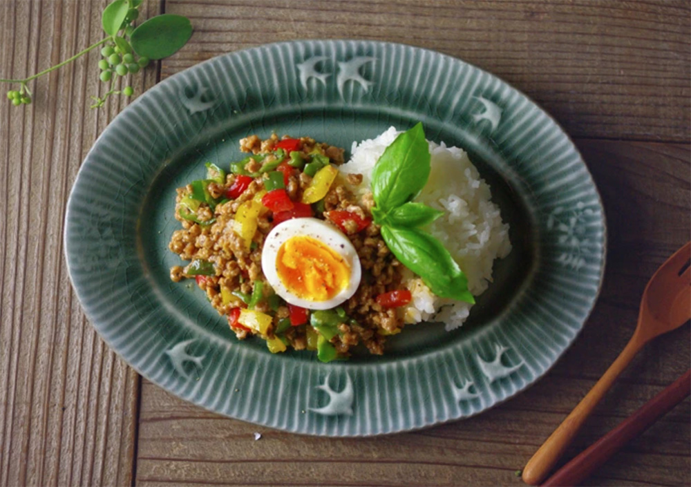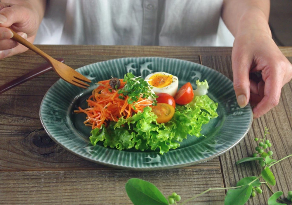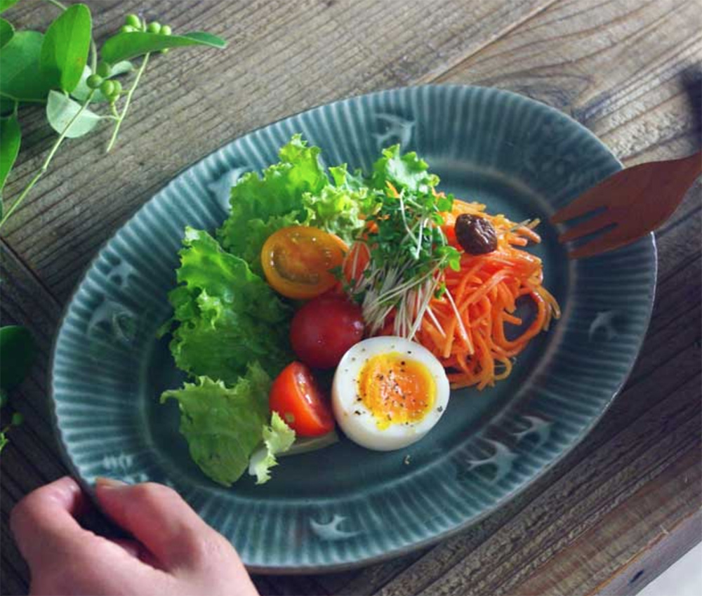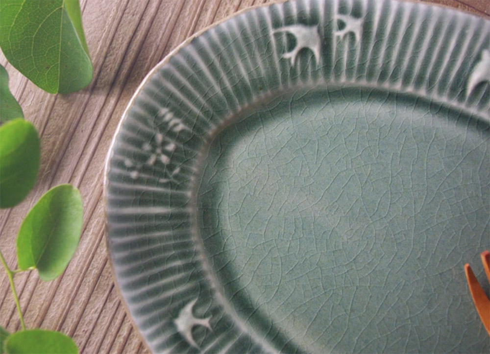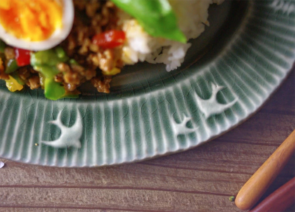 若林健吾益子燒的新系列作品,帶有可愛小鳥及花草,在線條盤緣上以浮雕圖案呈現。別緻的灰綠色釉料,自然而日常的氛圍,讓人感受到手工溫暖的作品。橢圓盤可以做為主菜盤或一個人用餐的個人盤,實用度極高。
