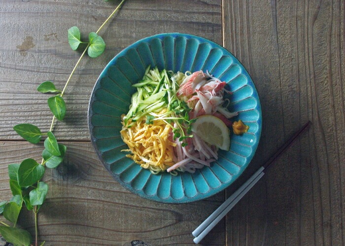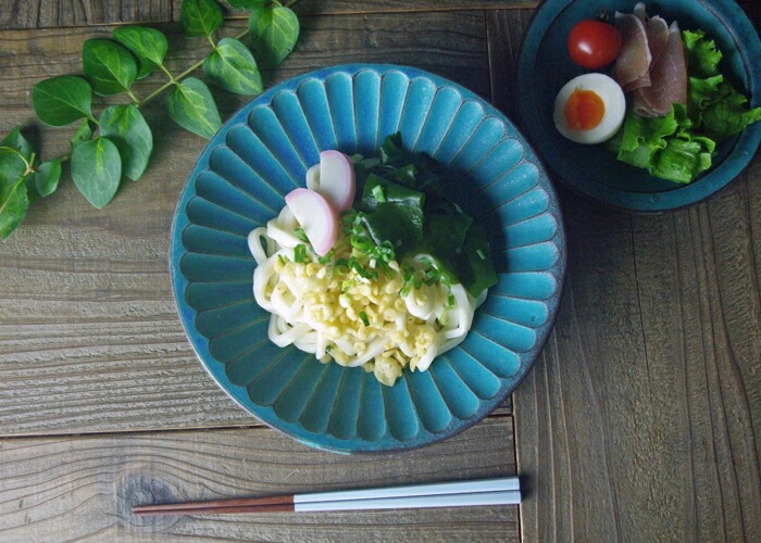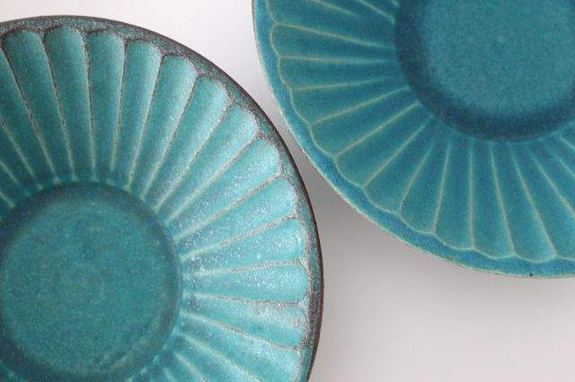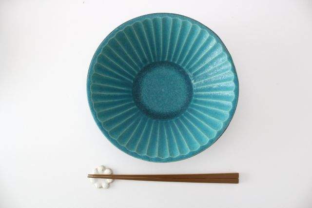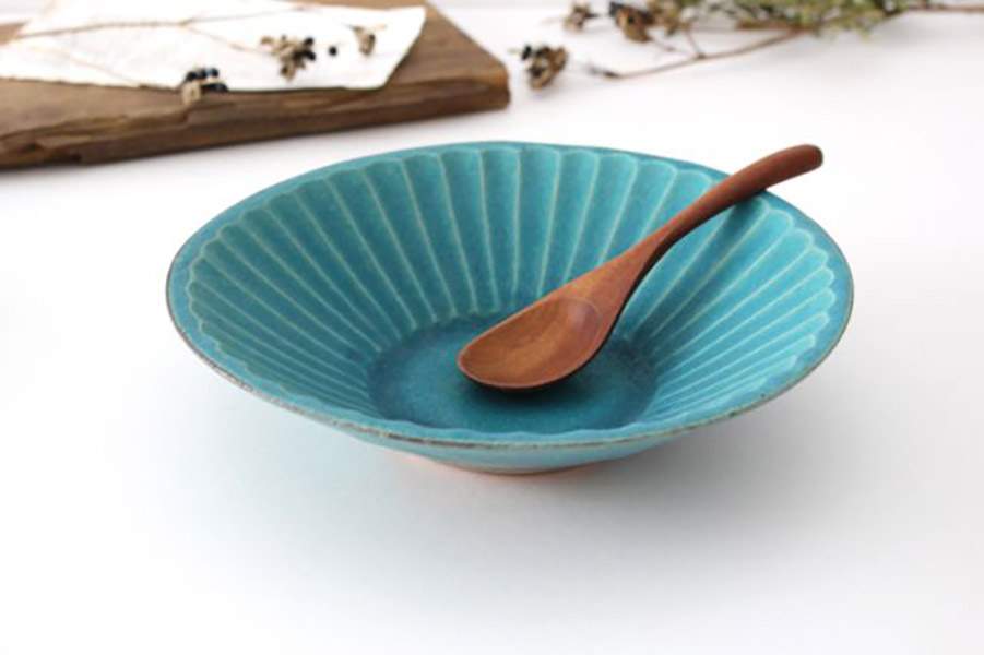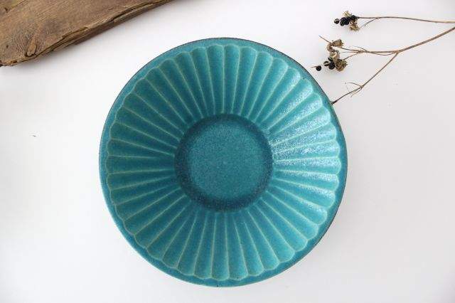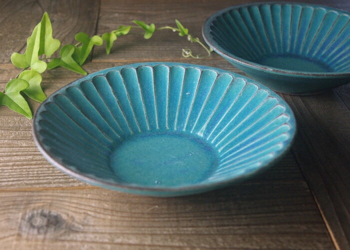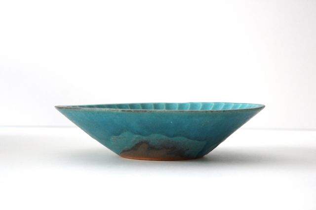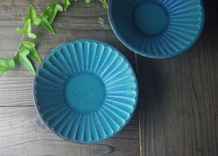 自然流動的釉料及樸實質感,器皿邊緣還搭配著類似古董氧化後金屬鏽色光澤,是若林健吾獨家開發的釉色。 將現代流行的土耳其藍,轉化成益子燒的樸實風格,較強烈的色調,也能將日常料理襯映出不同的視覺效果,日常使用也毫無違和感。