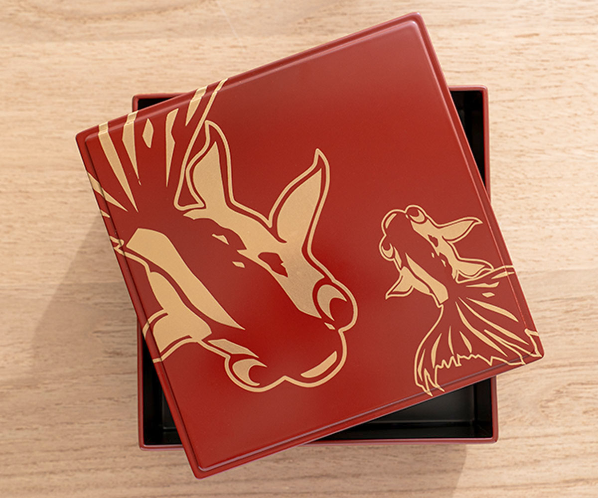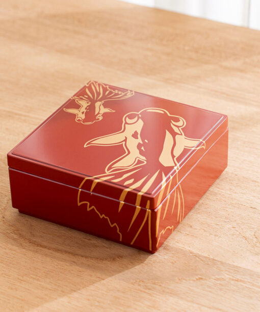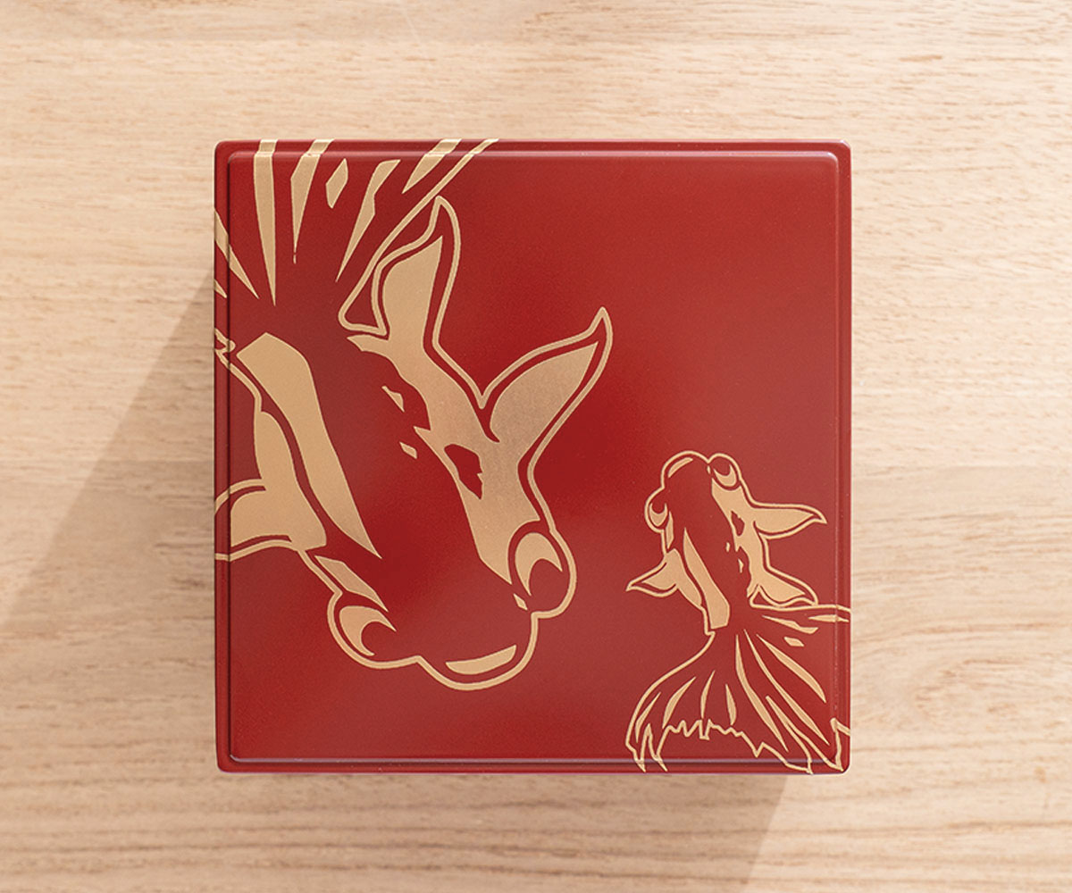 出自日本皇室御用漆器品牌「山田平安堂」,結合傳統工藝與現代雅趣,以細緻漆繪描繪出金魚悠然游動的優美姿態。朱紅漆面上兩尾金魚悠游自如,金彩描繪生動靈巧,象徵富貴與祥和,為餐桌增添一抹靜謐與詩意。盒身為一段式設計,適合作為甜點、茶點、和菓子或小物收納之用,內部採用黑漆襯底,襯托出食材的色彩與層次。