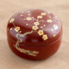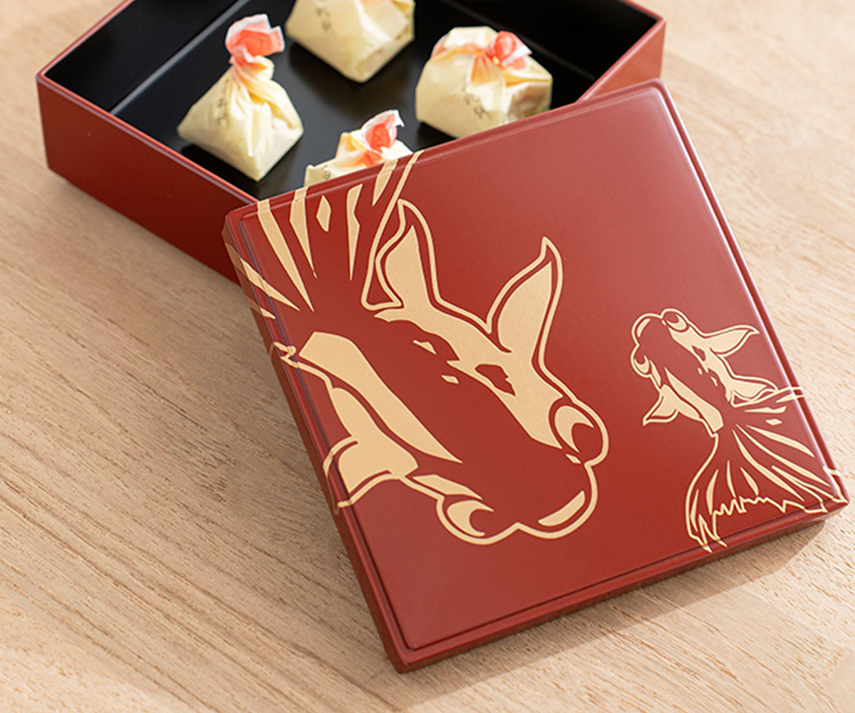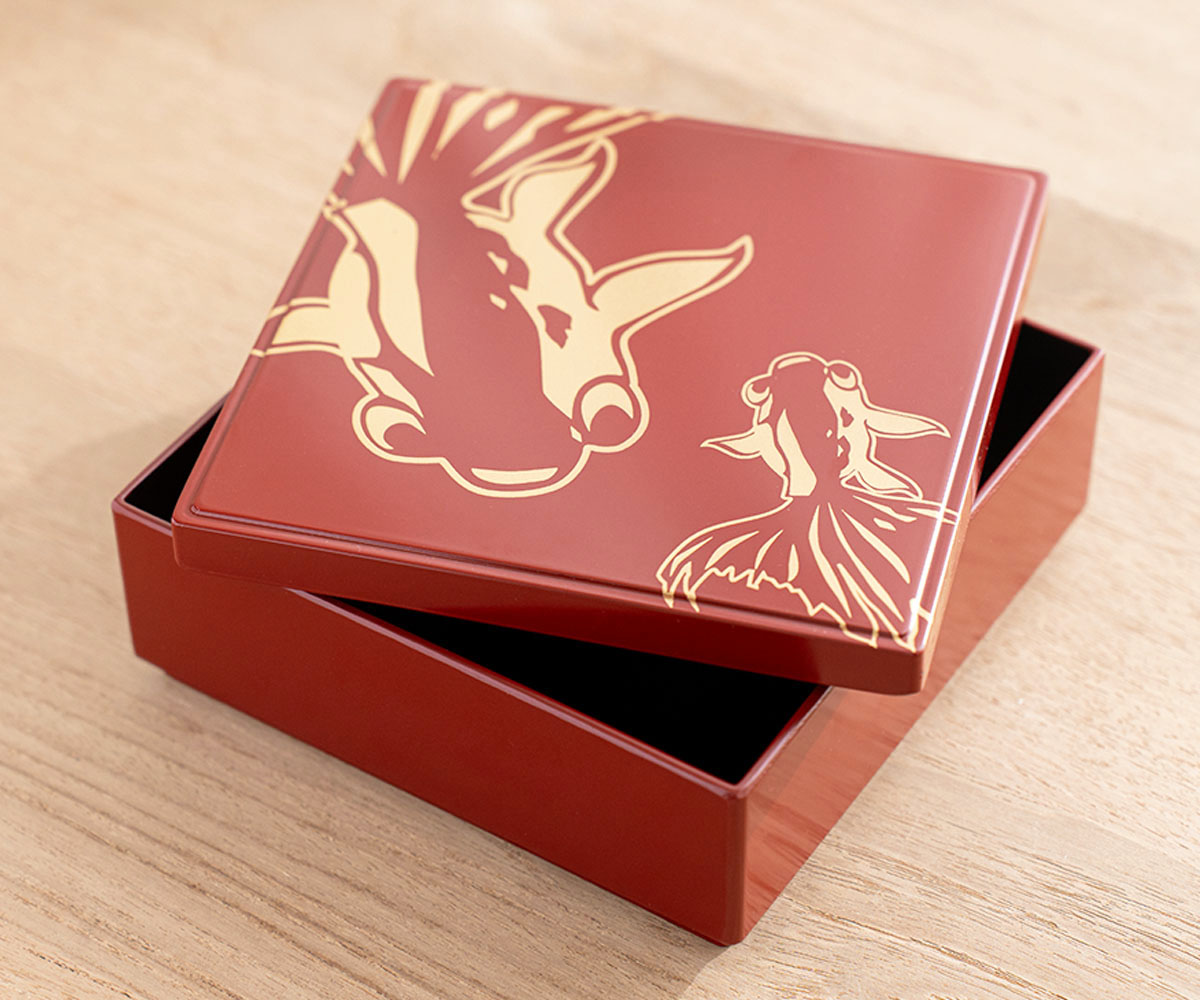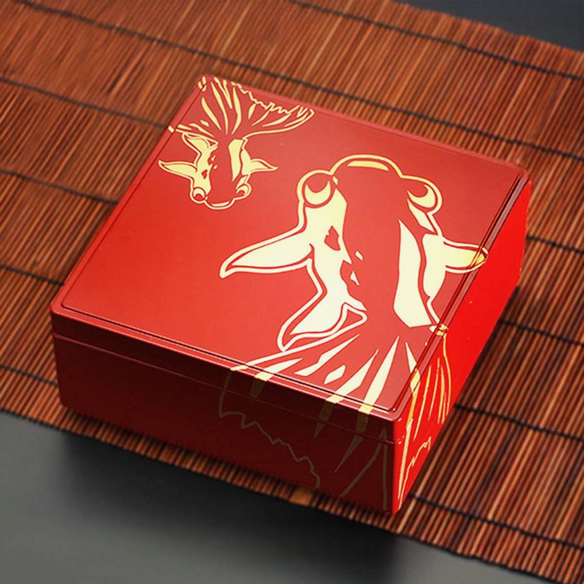出自日本皇室御用漆器品牌「山田平安堂」,結合傳統工藝與現代雅趣,以細緻漆繪描繪出金魚悠然游動的優美姿態。朱紅漆面上兩尾金魚悠游自如,金彩描繪生動靈巧,象徵富貴與祥和,為餐桌增添一抹靜謐與詩意。盒身為一段式設計,適合作為甜點、茶點、和菓子或小物收納之用,內部採用黑漆襯底,襯托出食材的色彩與層次。