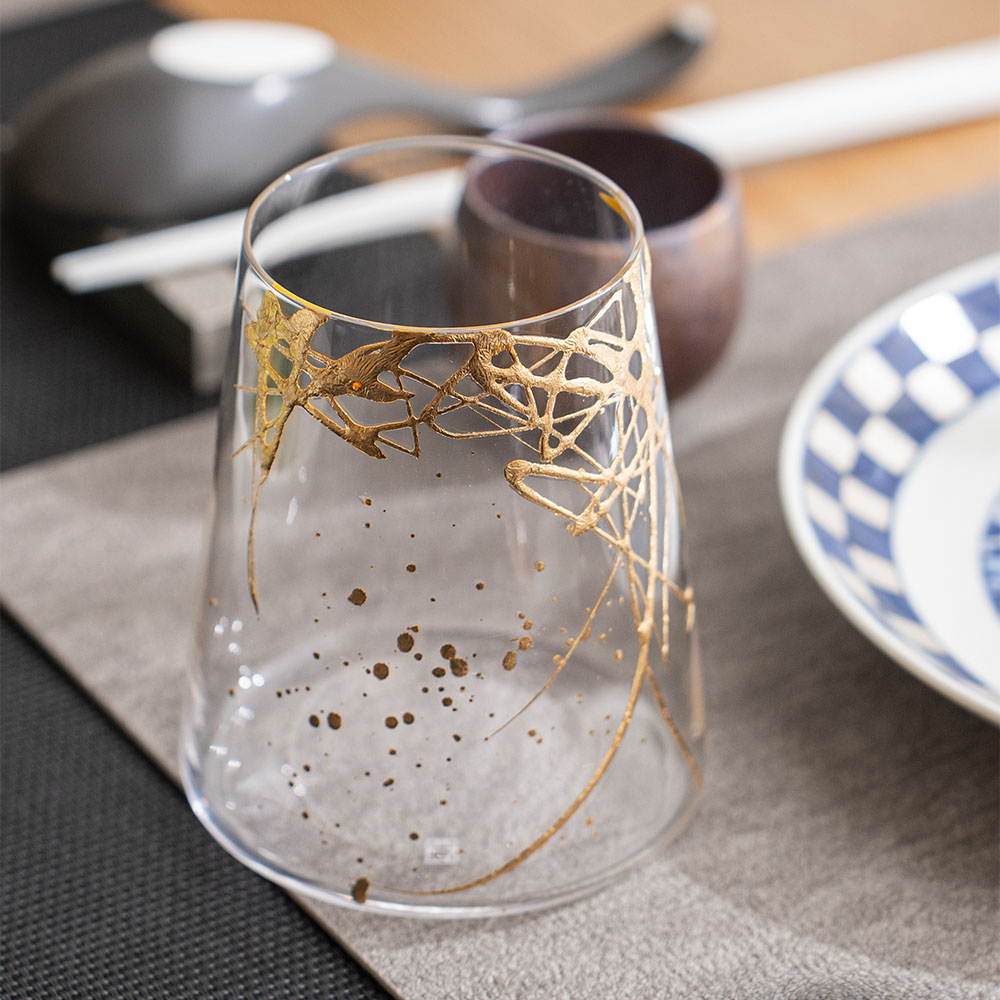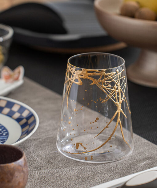 職人以時繪技法,打造玻璃杯身上,如潑灑漂亮金彩線條的水波感及藝術風格,具獨特個性的杯子設計,是贈禮的品味之選。