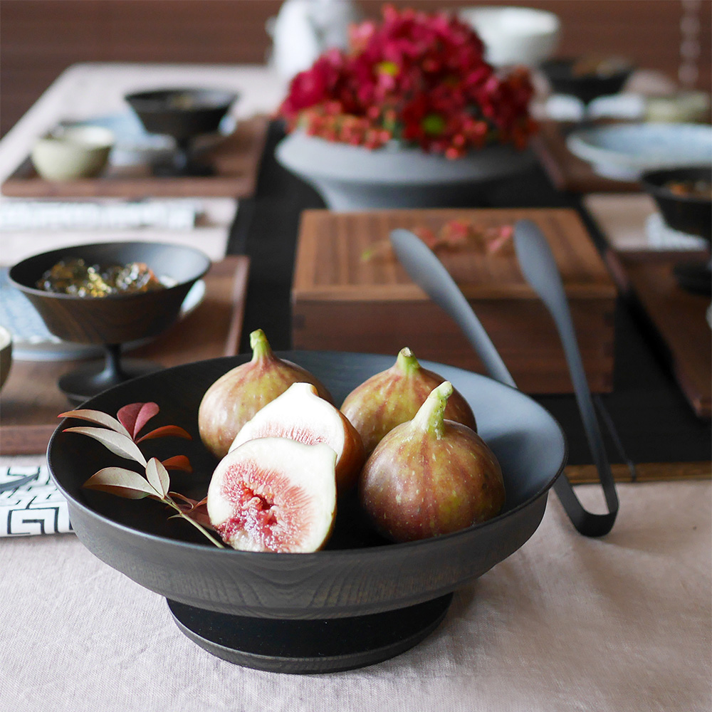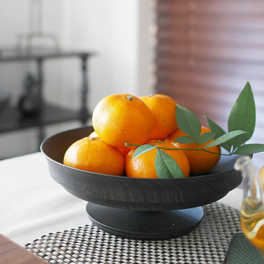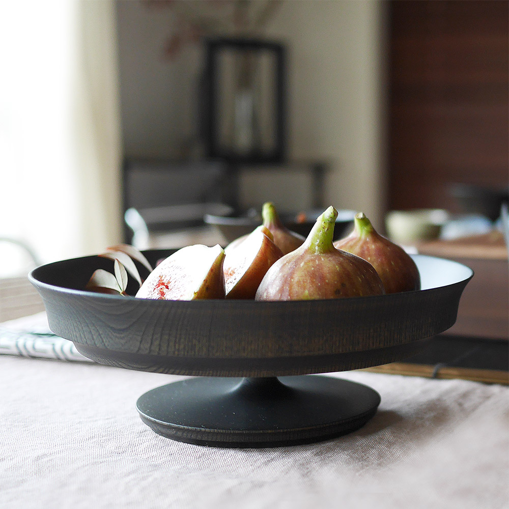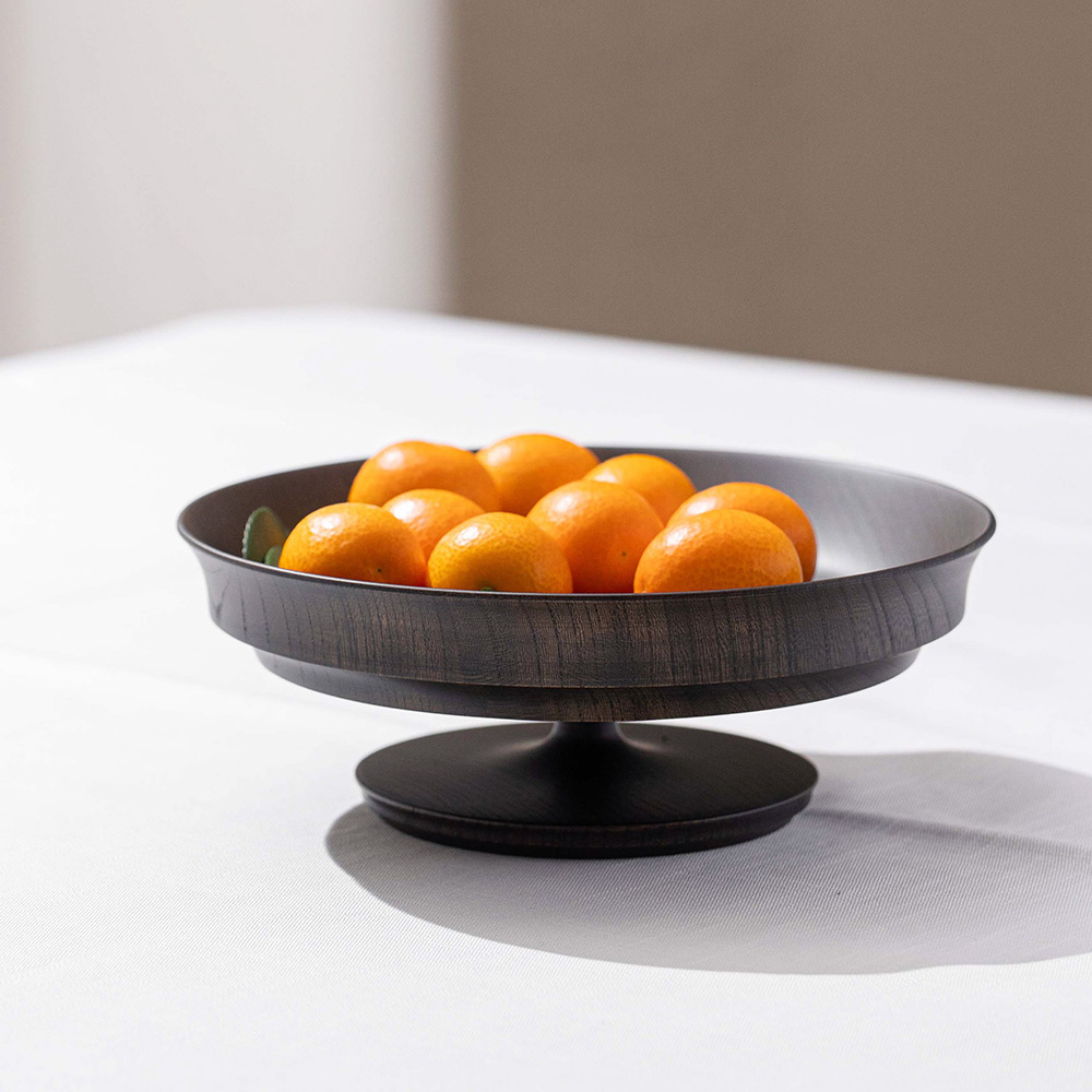 表面採用「拭漆」工藝,將生漆反覆擦拭滲透進木材紋理中,呈現出深邃的黑色外觀,同時保留並突顯了欅木天然、獨特的紋理與質感,隨著時光流轉,光澤愈發溫潤迷人。這款商品非常適合用作盛裝水果、甜點、沙拉,充分展現餐桌上的現代美學與儀式感。